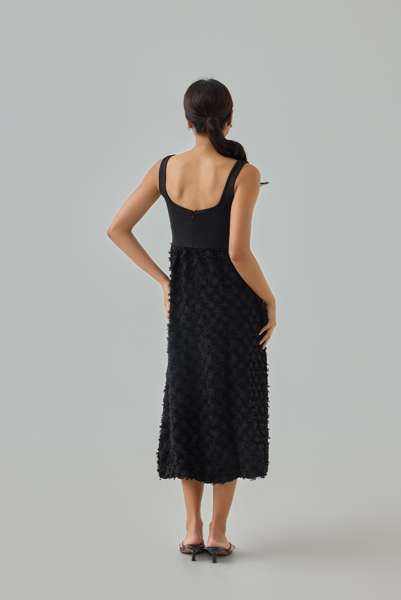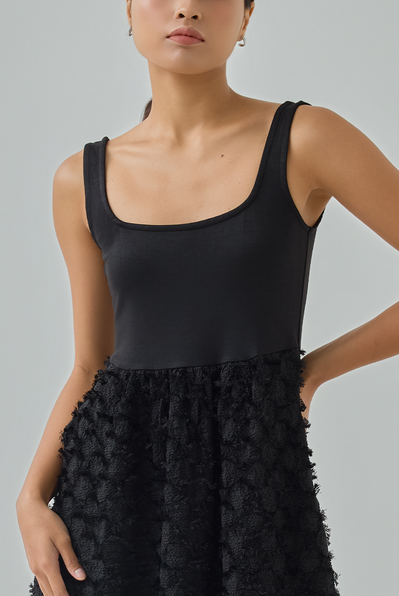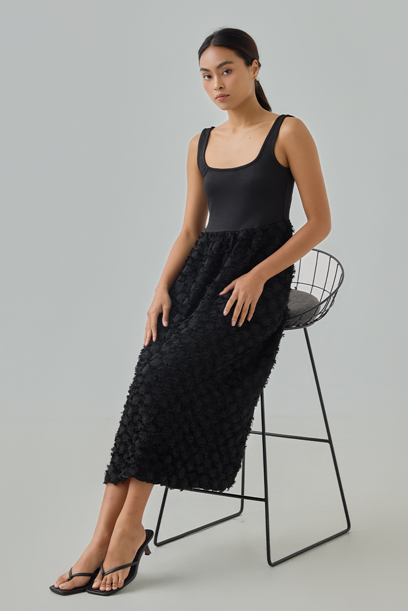 A little sleek, a little playful — this midi dress blends a clean fitted bodice with a fun, fringe-textured skirt that moves with every step. Perfect for days you want comfort and compliments.