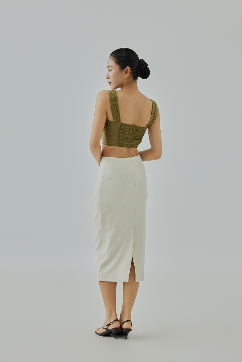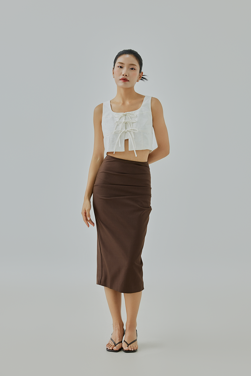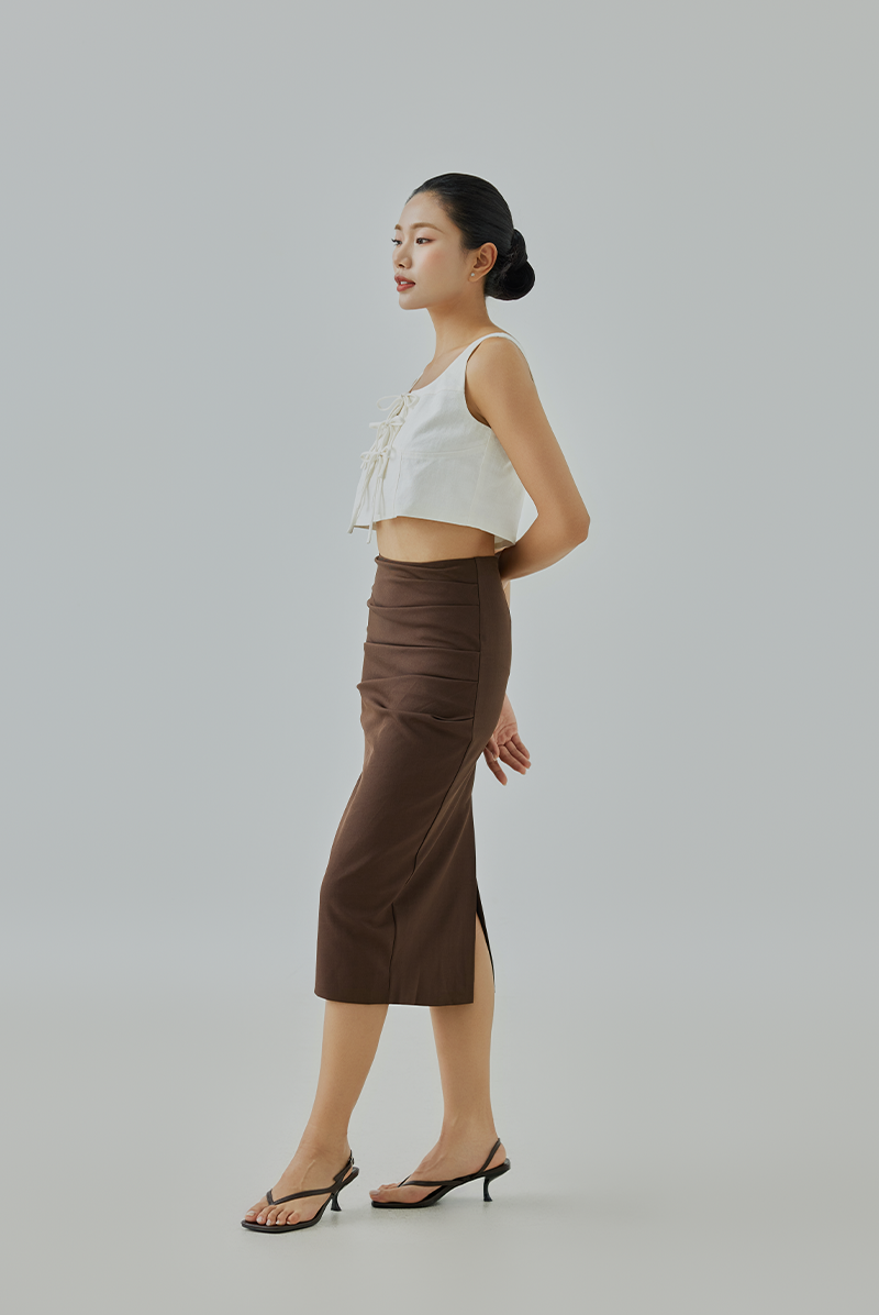 A sleek midi pencil skirt featuring side spaced-out gathering for a unique, textured ruching detail at the front. Finished with a concealed back zipper and a subtle slit for added movement and style.