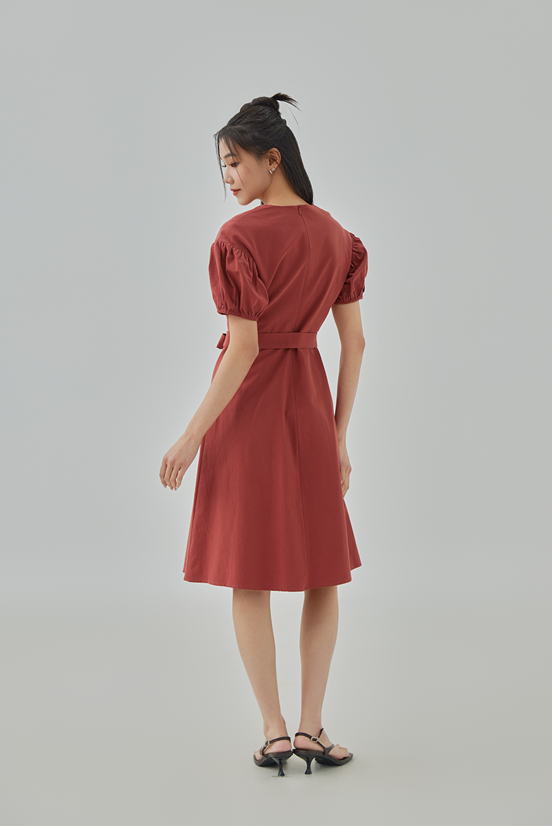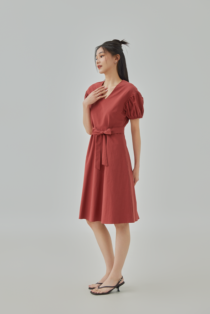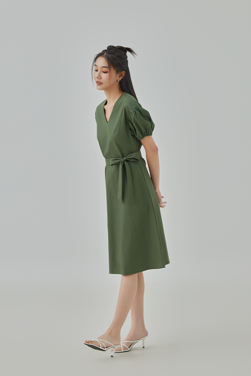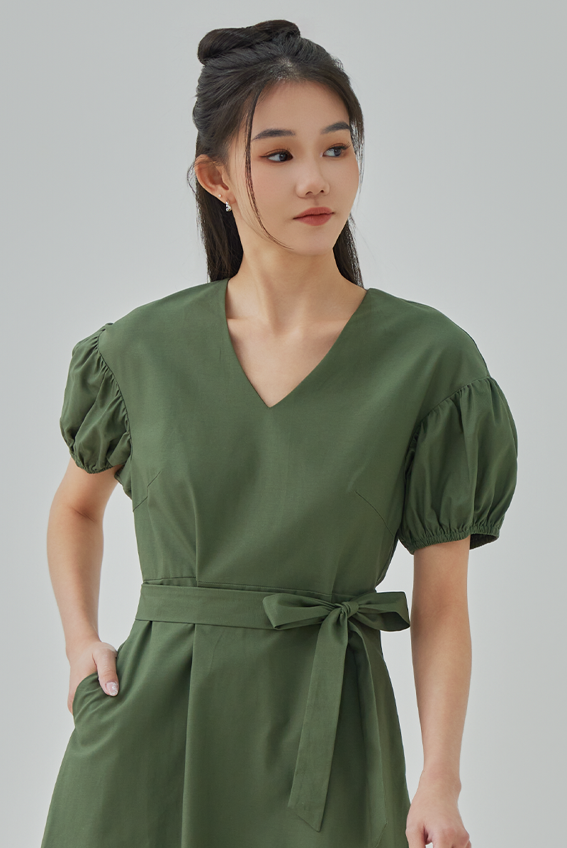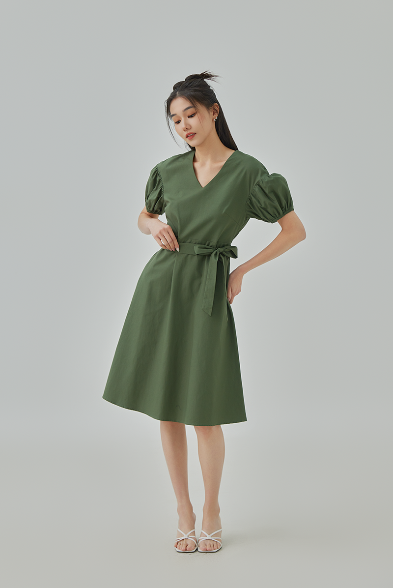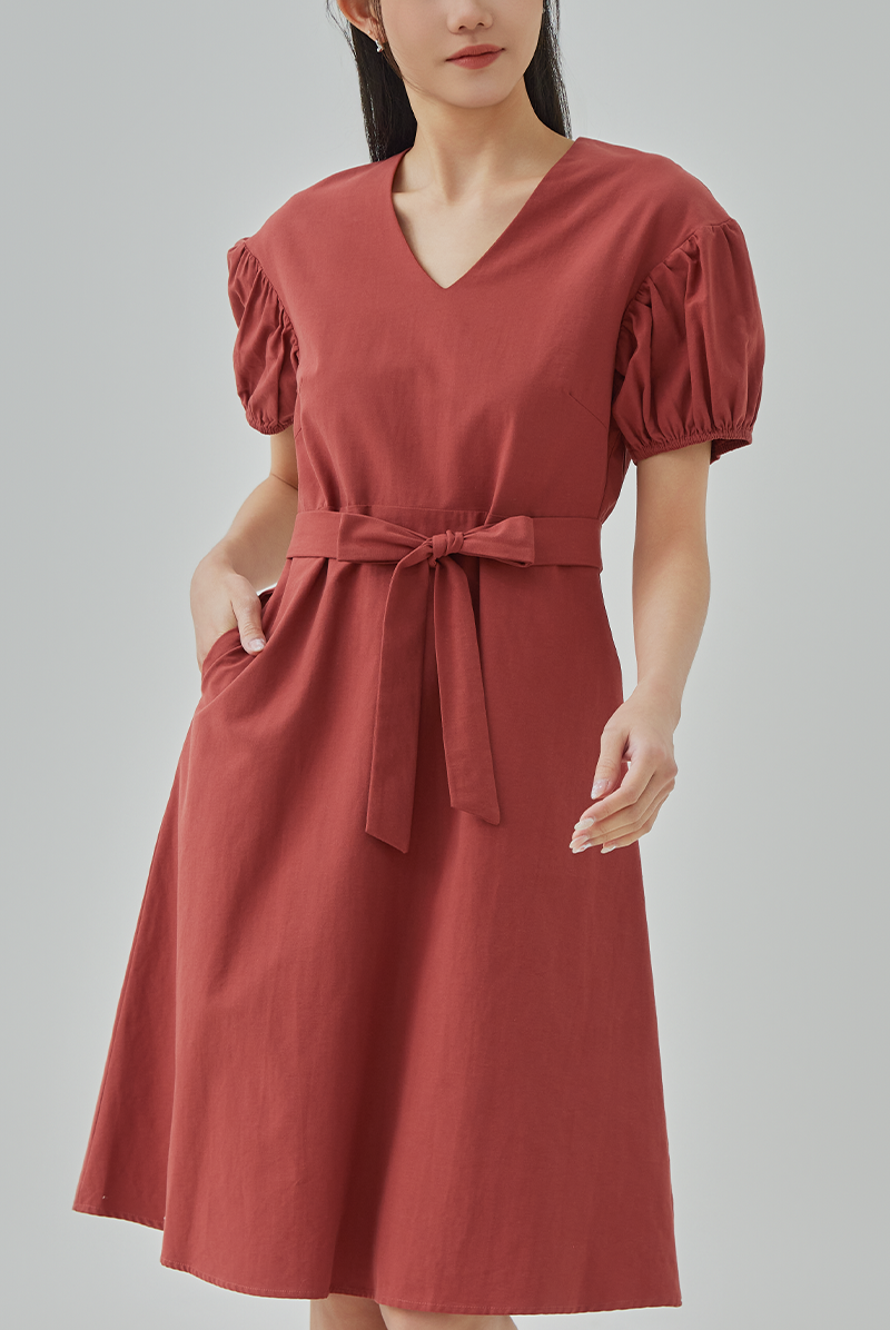 This knee-length dress features a flattering V-neckline and short puff sleeves, adding a playful yet elegant touch. Functional side pockets and a back concealed zipper for a neat look. To complete the fit, it comes with a detachable belt, allowing you to cinch the waist for a more defined silhouette or wear it relaxed for a more laid-back vibe. Perfect for a variety of occasions!