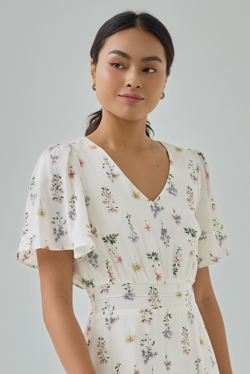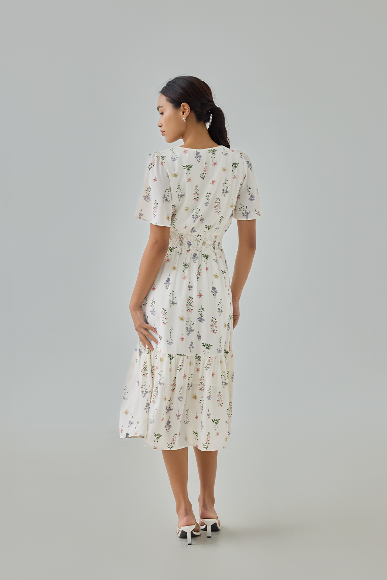 Bright, breezy, and instantly mood-lifting — Aurelia is that floral dress you throw on and feel instantly pretty in. With a flattering V neckline, soft fluttery sleeves, and a cinched waist that still feels comfy thanks to the smocked back, it’s made for easy days out.
