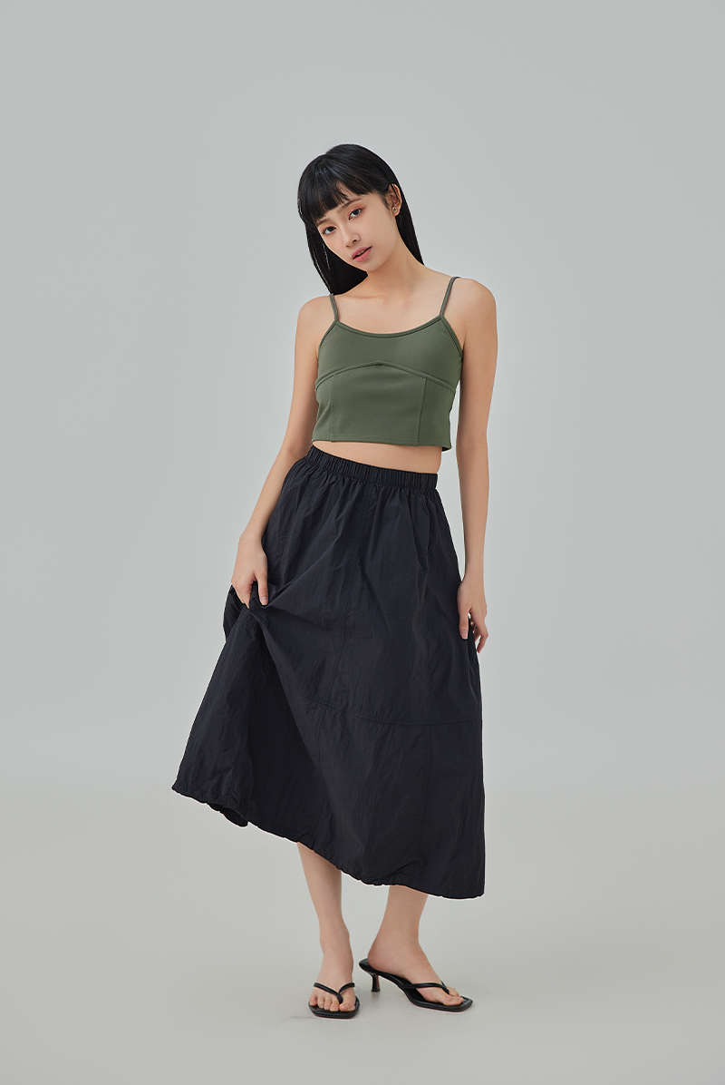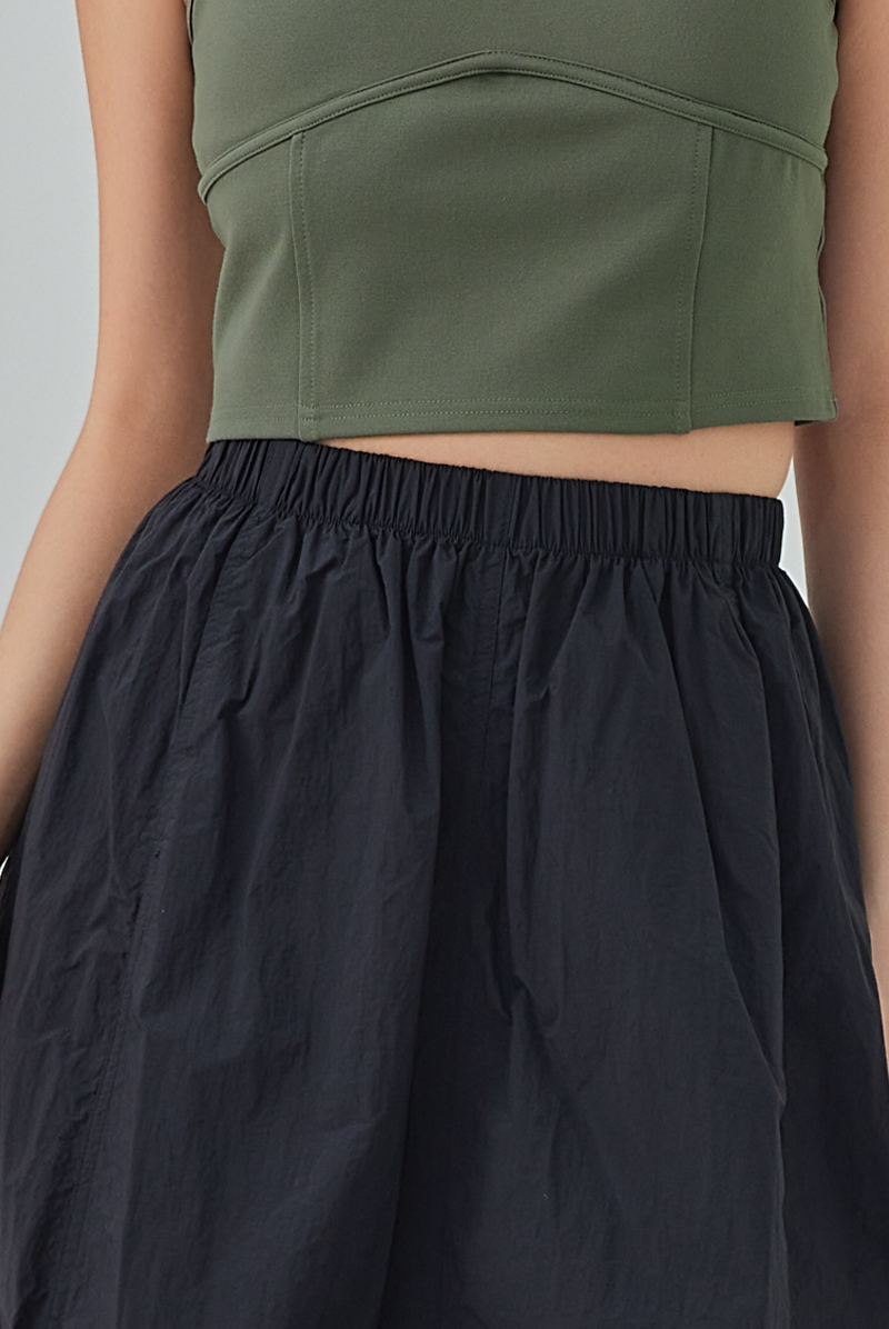 Float through your day in this parachute midi skirt, featuring a comfy elastic waistband and low-tiered detail with a drawstring hemline (changing from A-Line to bubble silhouette in an instant) that add just the right amount of drama. It's breezy, effortless, and perfect for twirling—or just owning the room with your low-key flair.
