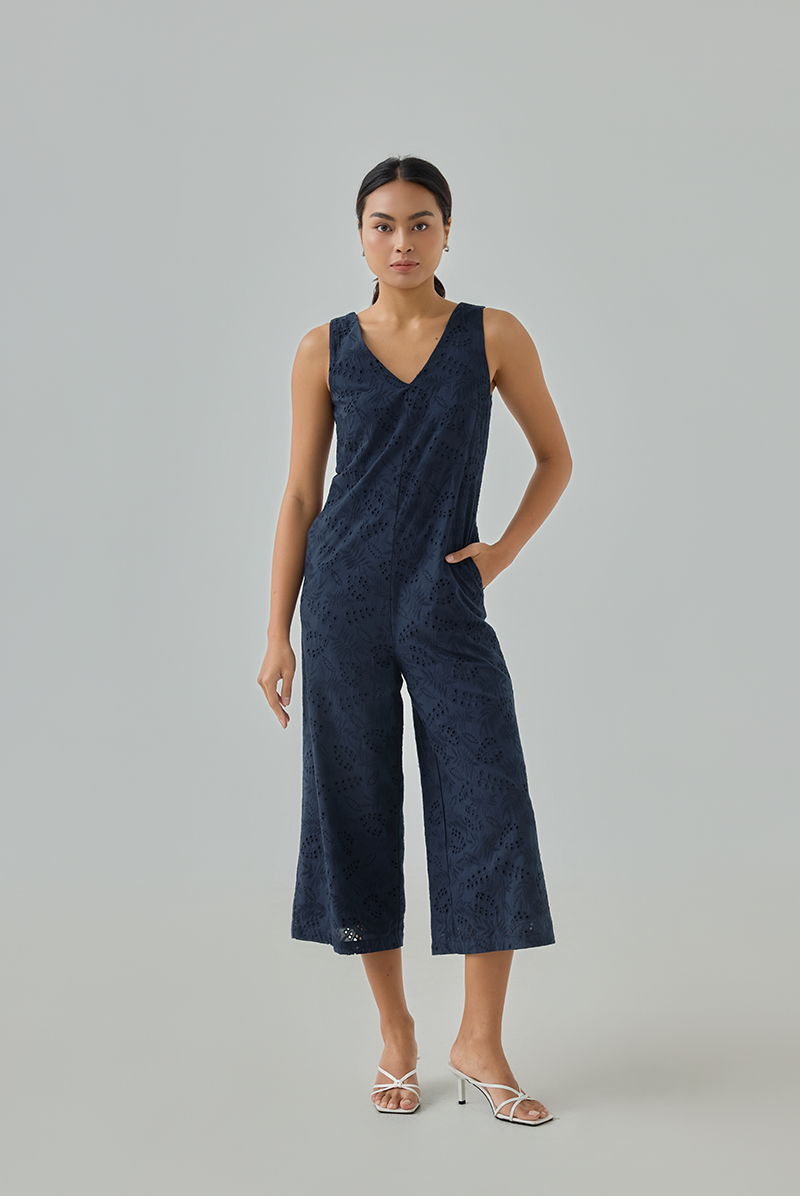 Elevate your everyday style with this embroidered jumpsuit! Its delicate embroidery, flattering V-neck and V-back, and cropped length make it effortlessly chic from day to night.