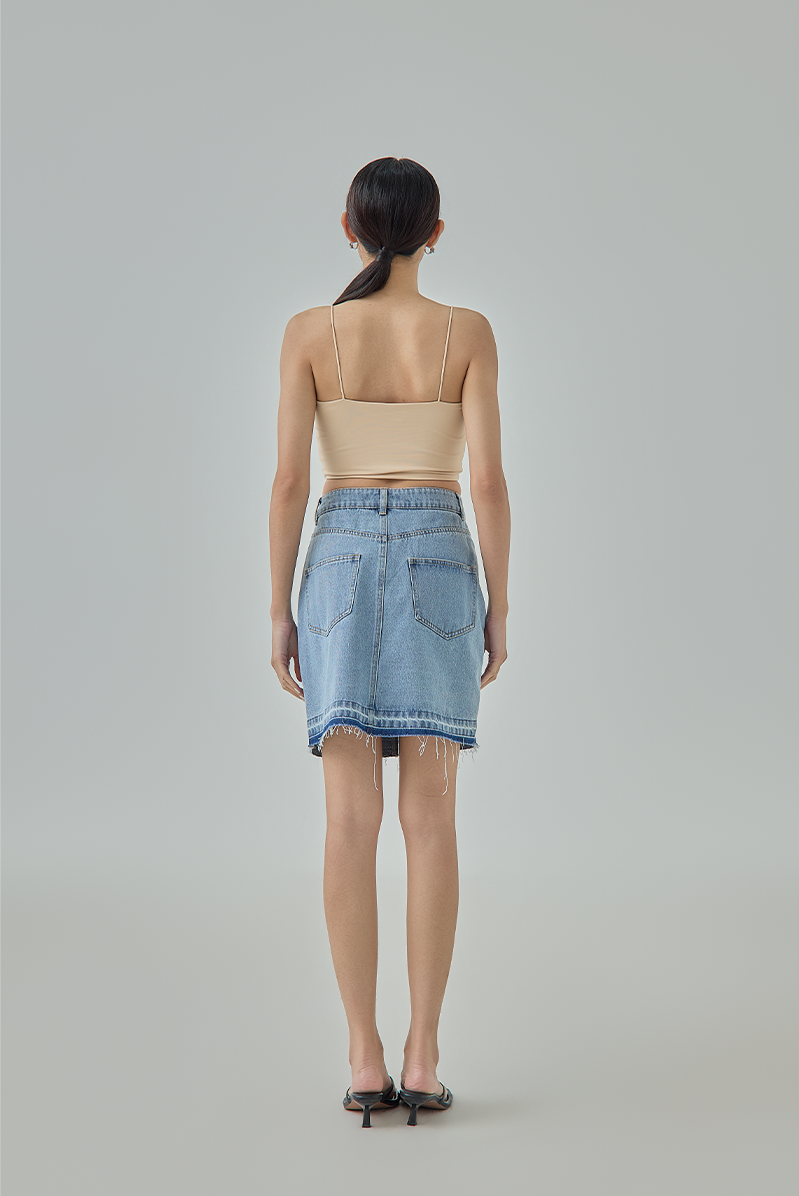 A timeless denim mini skirt designed with a clean, flattering silhouette and everyday versatility. The structured denim fabric holds its shape beautifully, while the raw frayed hem adds a casual, lived-in touch. Easy to pair with almost anything, this piece is a staple for effortless styling.