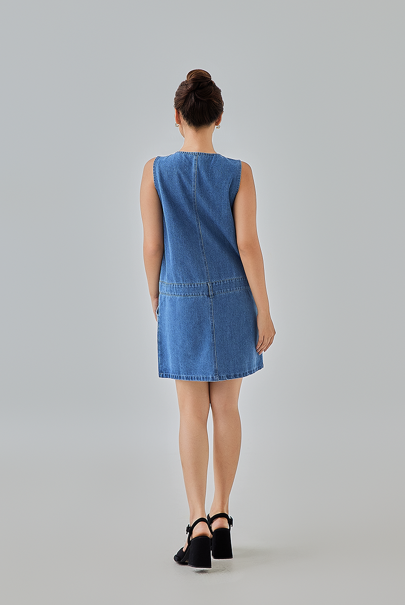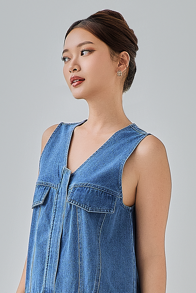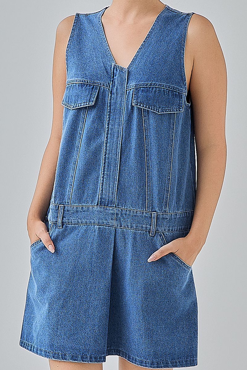 This mini denim dress brings edgy vibes with a flattering V-neck and sleek hidden zipper down the front. The cute decorative flaps add style, while the functional side pockets and belt loops make it as practical as it is fun. Perfect for rocking a casual-chic look!