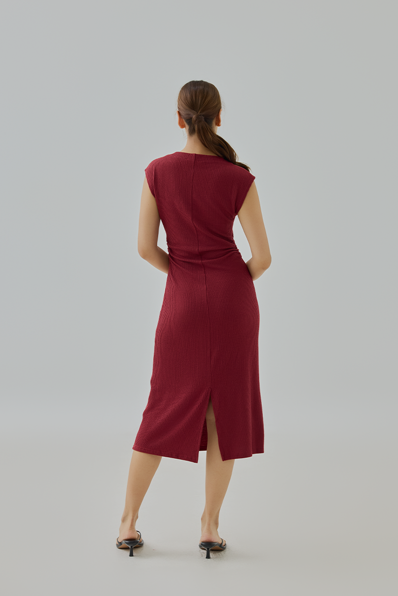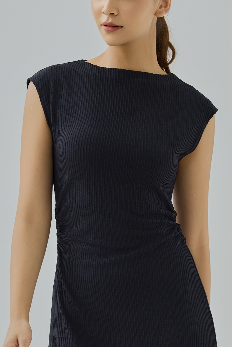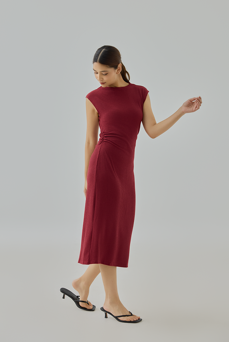A ribbed knit midi dress designed for effortless style and comfort. Featuring a high round neckline, side ruching, and a subtle back slit, it flatters your silhouette while keeping things chic and easy.