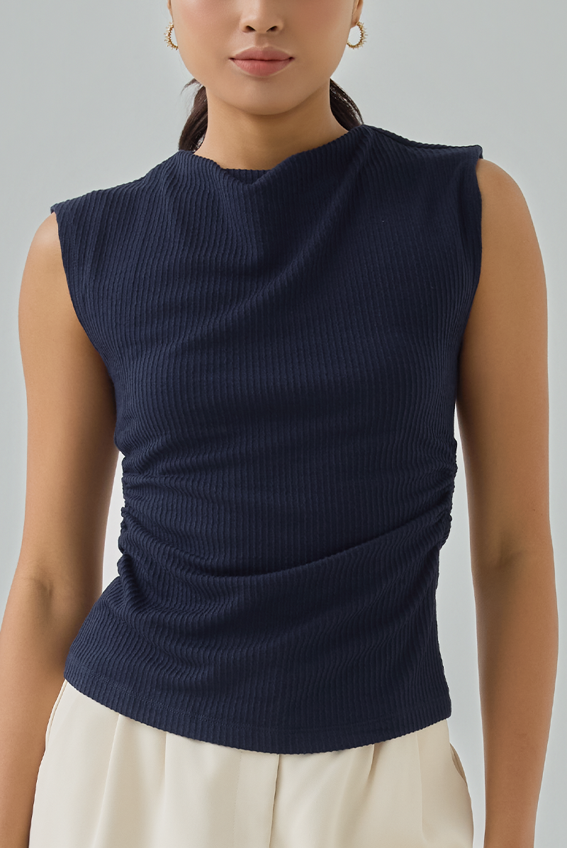 This ribbed knit tunic top features a high round neckline and slightly capped sleeves, exuding a laid-back yet refined vibe. The side ruching adds a touch of flattering detail, gently cinching in to create a soft, elegant silhouette. Whether dressed up with a sleek pair of pants or paired with shorts for a more casual look, this versatile piece is an effortlessly stylish staple for any wardrobe.
