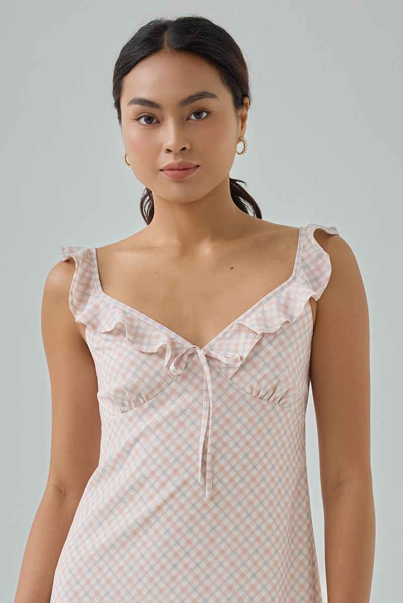 Sweet and effortlessly cute — this checkered mini dress is made for sunny brunch dates and weekend strolls. The soft blush tones and ruffled neckline bring a touch of charm to your everyday style.