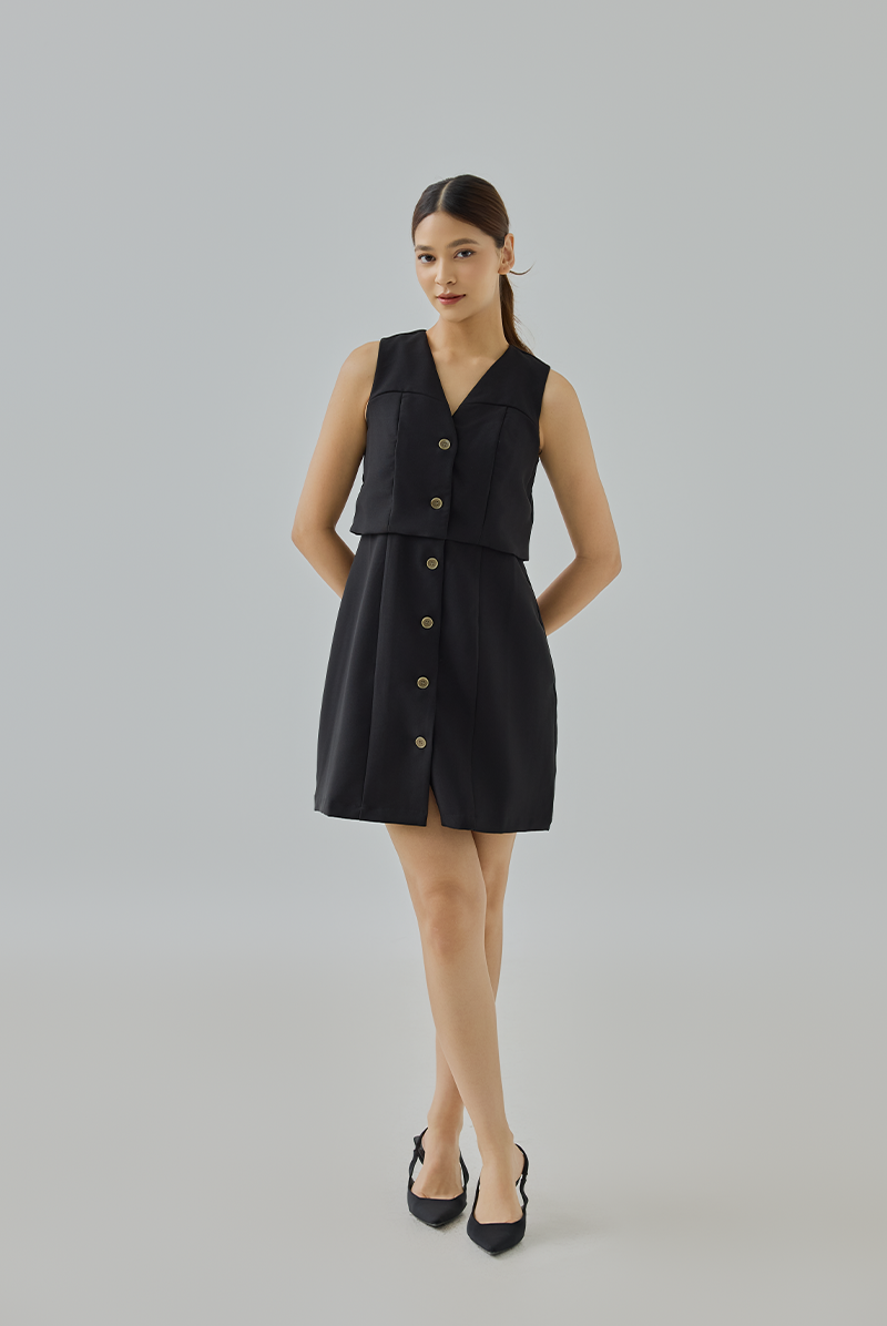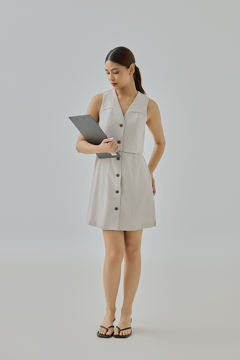 Effortlessly chic and versatile, this sleeveless mini dress features a clean button-down front design with a structured overlay bodice for a layered look. Tailored with a soft V-neckline and straight silhouette, it blends minimal elegance with a modern edge. A timeless wardrobe staple, perfect for both casual days and smart occasions.