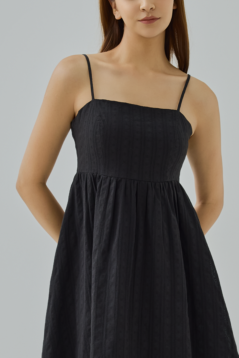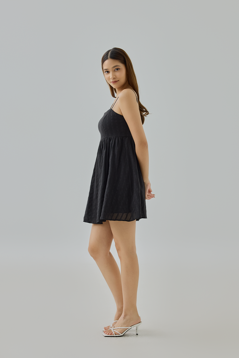 A sweet summer staple that flatters with every twirl. Crafted from a soft textured fabric, this mini dress features a fitted bodice with a padded bust for gentle structure and support. The slim adjustable straps and flared skirt create an effortlessly feminine silhouette, finished with a concealed back zipper for a seamless look.