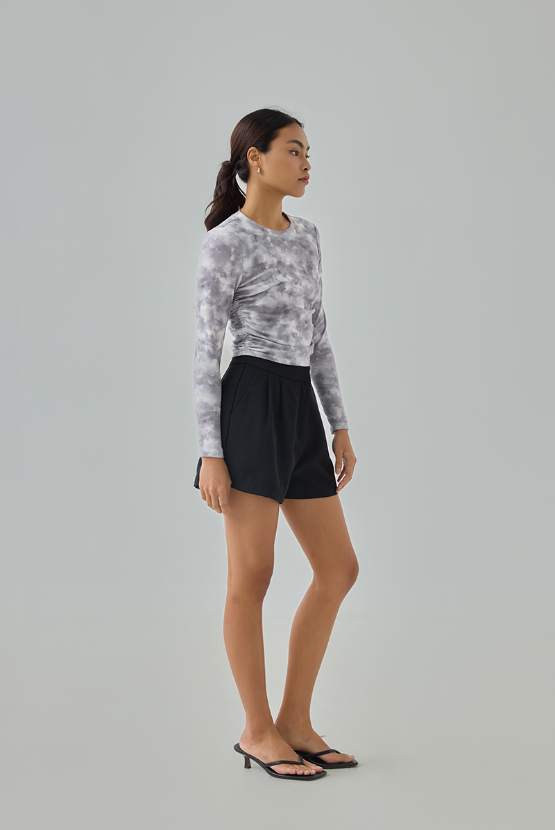 A sleek, modern staple — this grey watercolor print top brings an artsy edge to your wardrobe while keeping things effortlessly flattering.