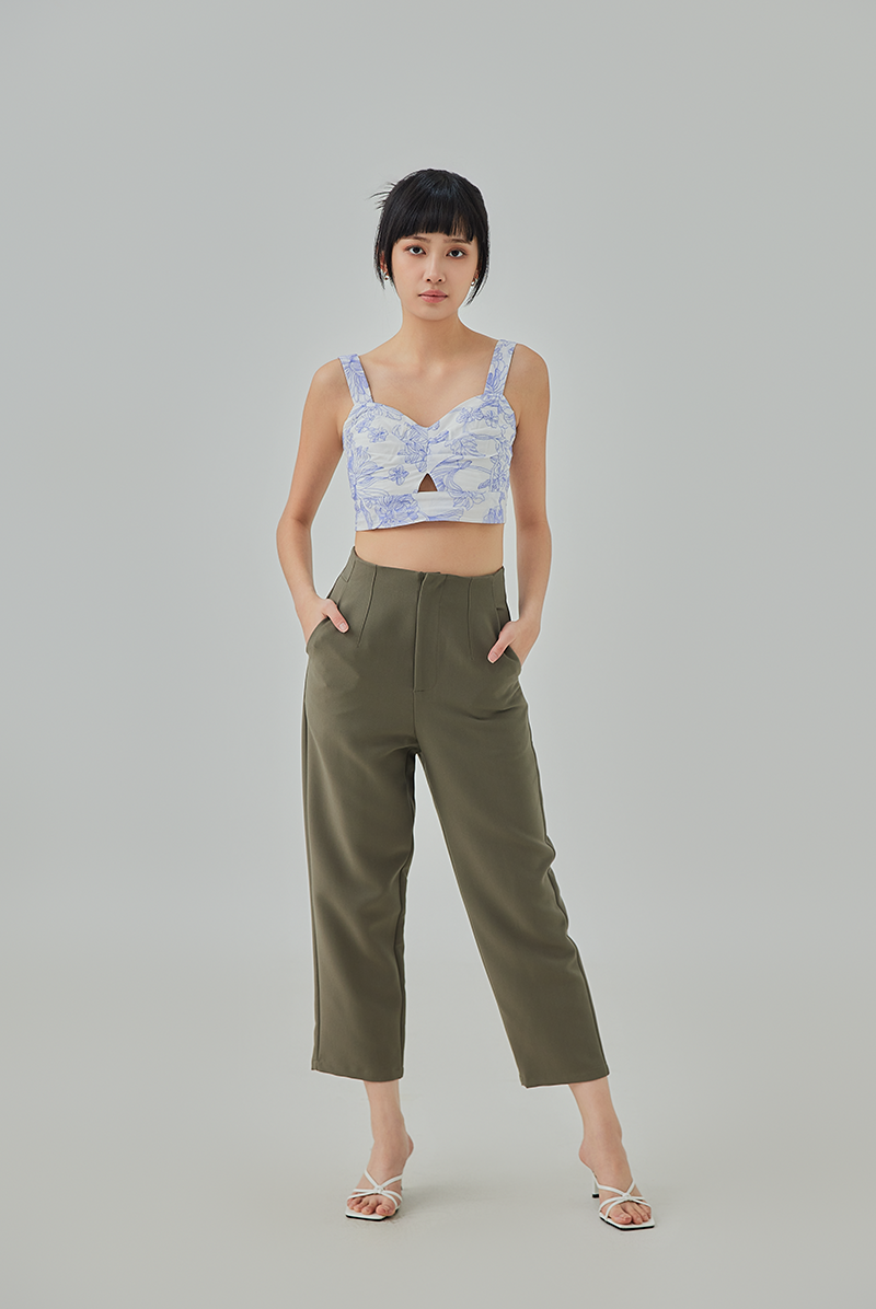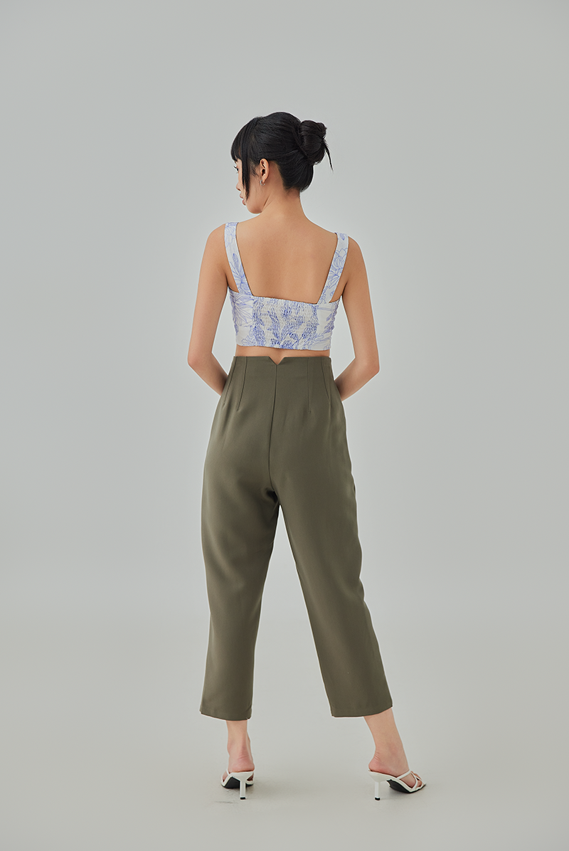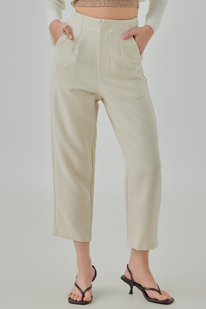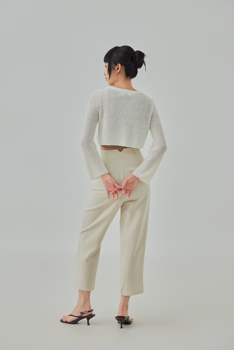 Sleek high-waisted cropped pants with a twist—no waistband, sharp front darts, handy side pockets, and a hook-zip closure. The back flaunts a cheeky V-cut for extra flair.