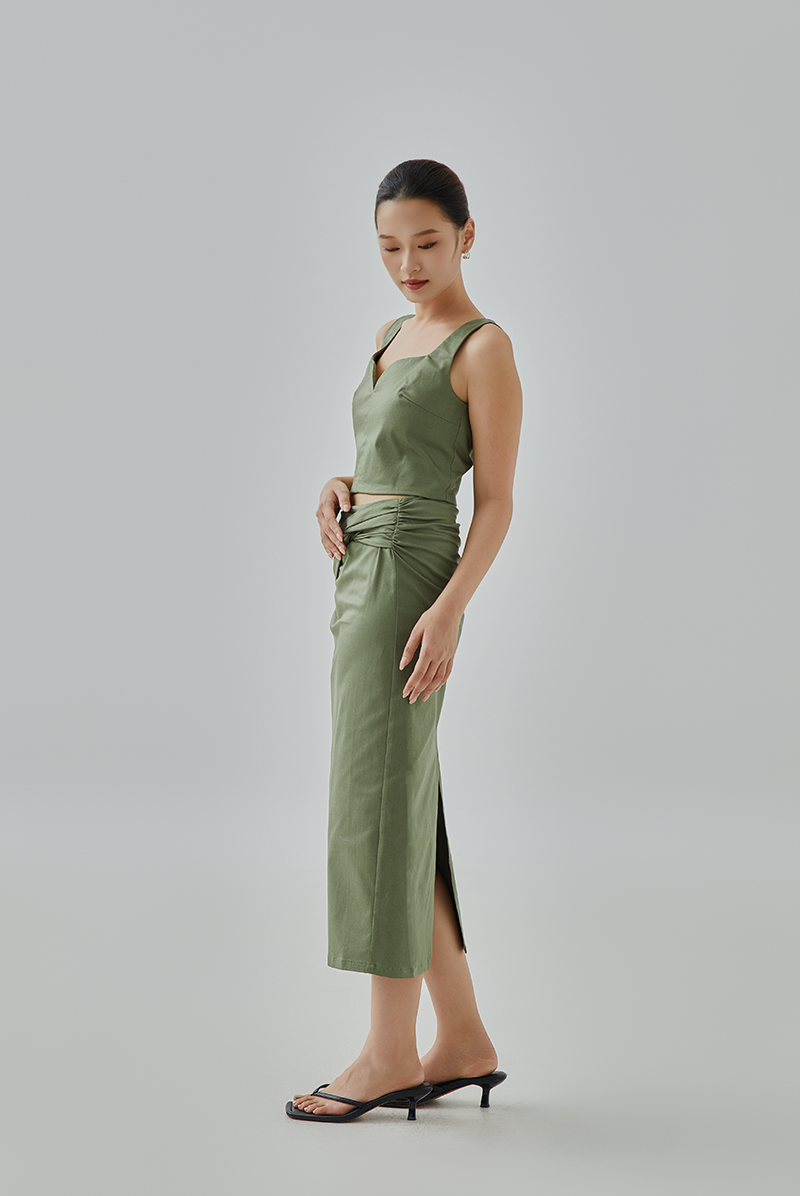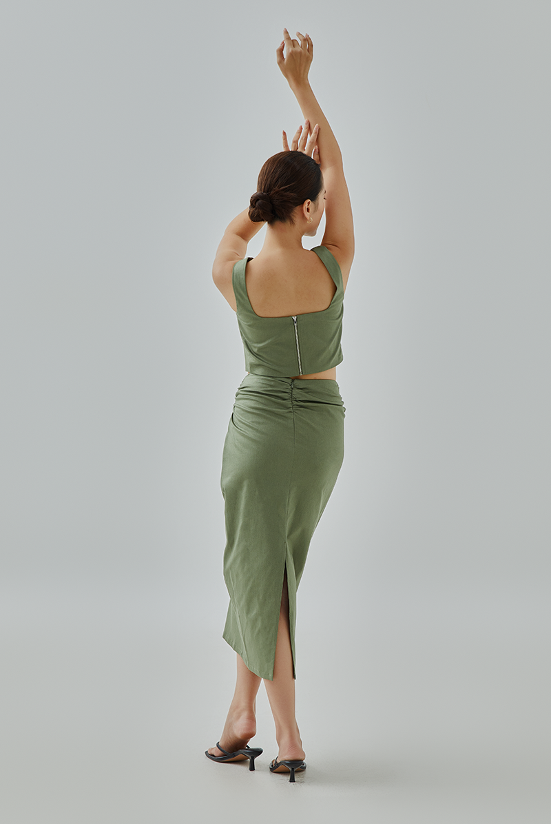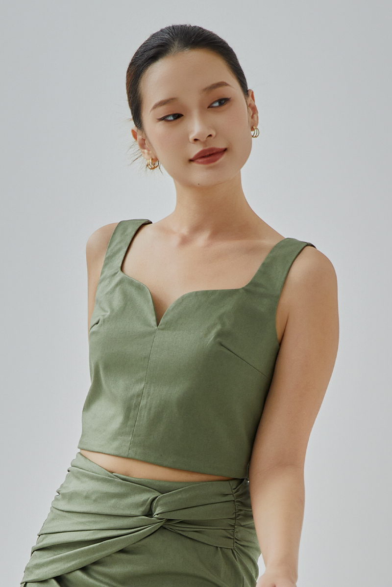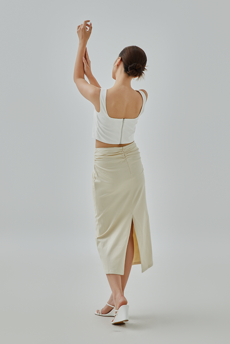 A sophisticated cropped top featuring a regal Queen Anne neckline, accentuating the décolletage with its elegant curves. The sleeveless design keeps it sharp and modern, while bust darts ensure a sculpted fit. A back metal zipper adds a touch of edge, perfectly balancing the structured silhouette. Cut to a cropped length, it pairs effortlessly with its matching Hyera Twist Knot Pencil Skirt, creating a chic and polished co-ord set—ideal for power dressing with a hint of allure!