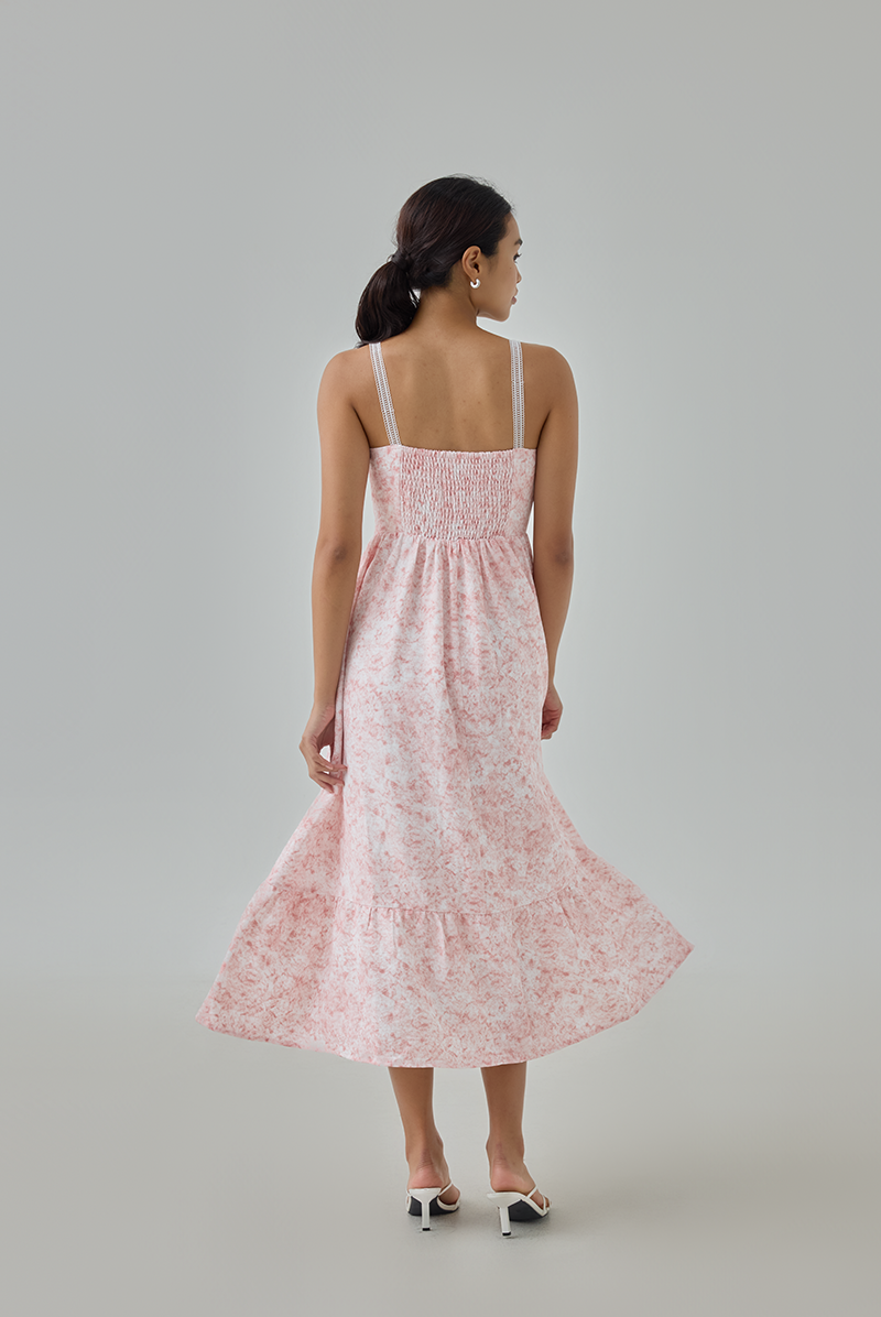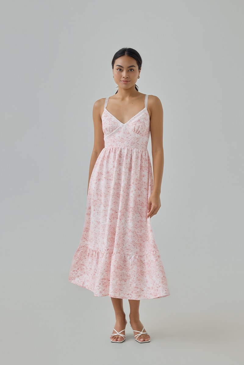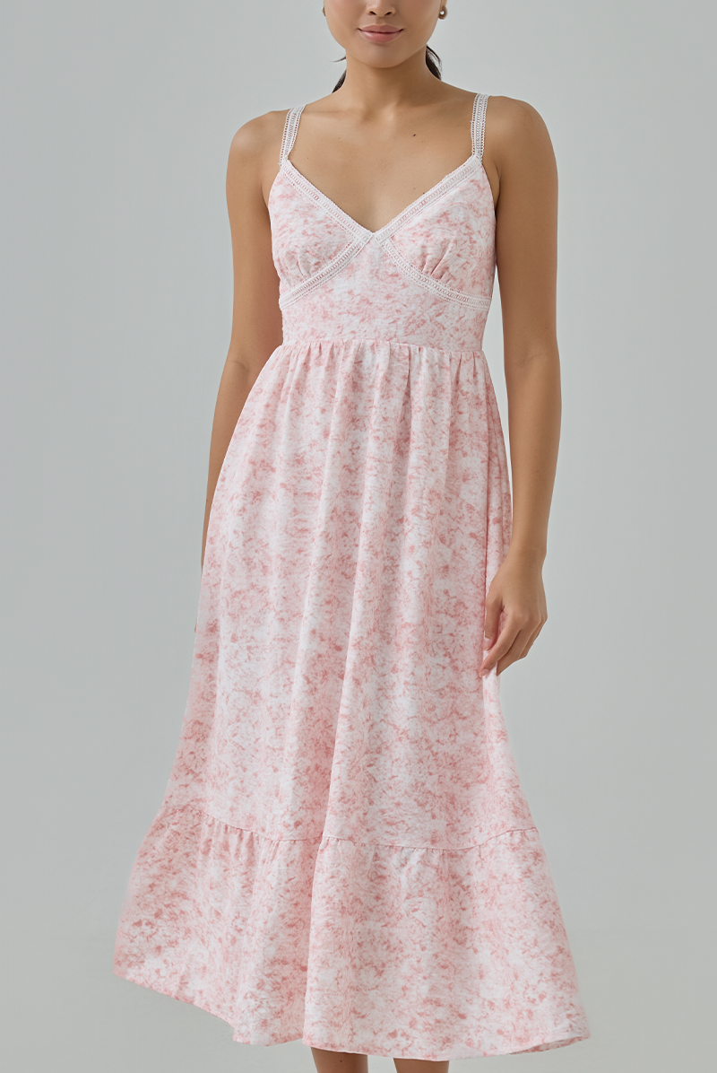 Say hello to the newest addition to our Inez series — now in a soft, romantic pink watercolour print. She carries the same dreamy, artistic charm you loved in the original blue pieces, but with a sweeter, more feminine twist. With a bustier-style bodice and delicate lace straps, she’s the dress made for days you want to feel effortlessly pretty.