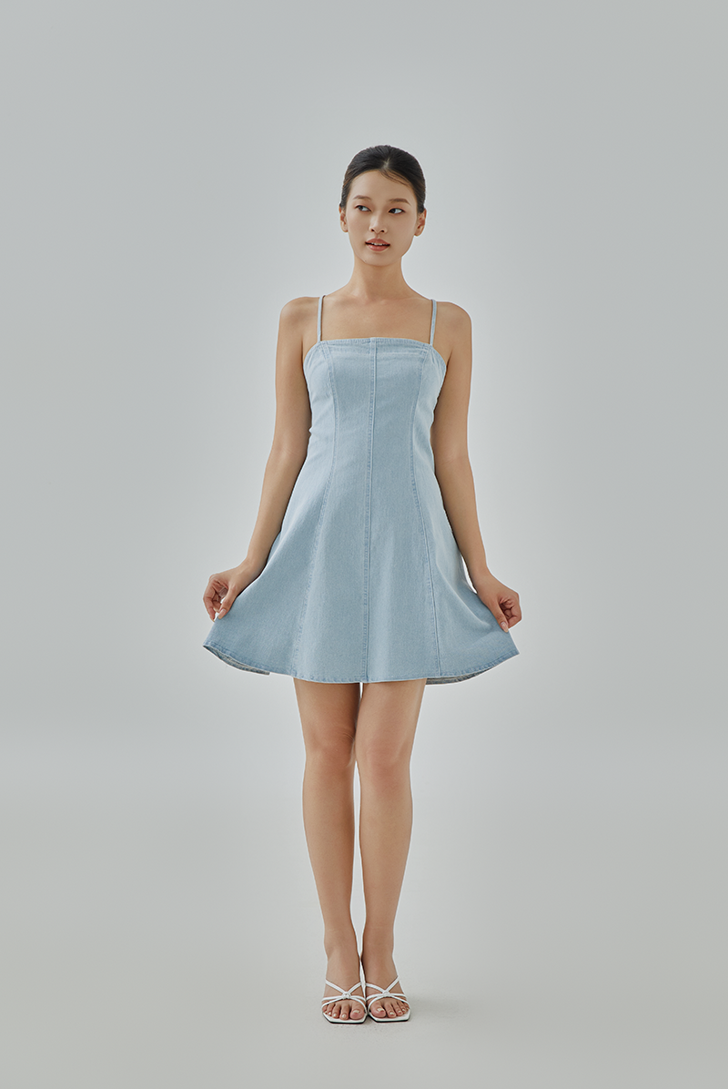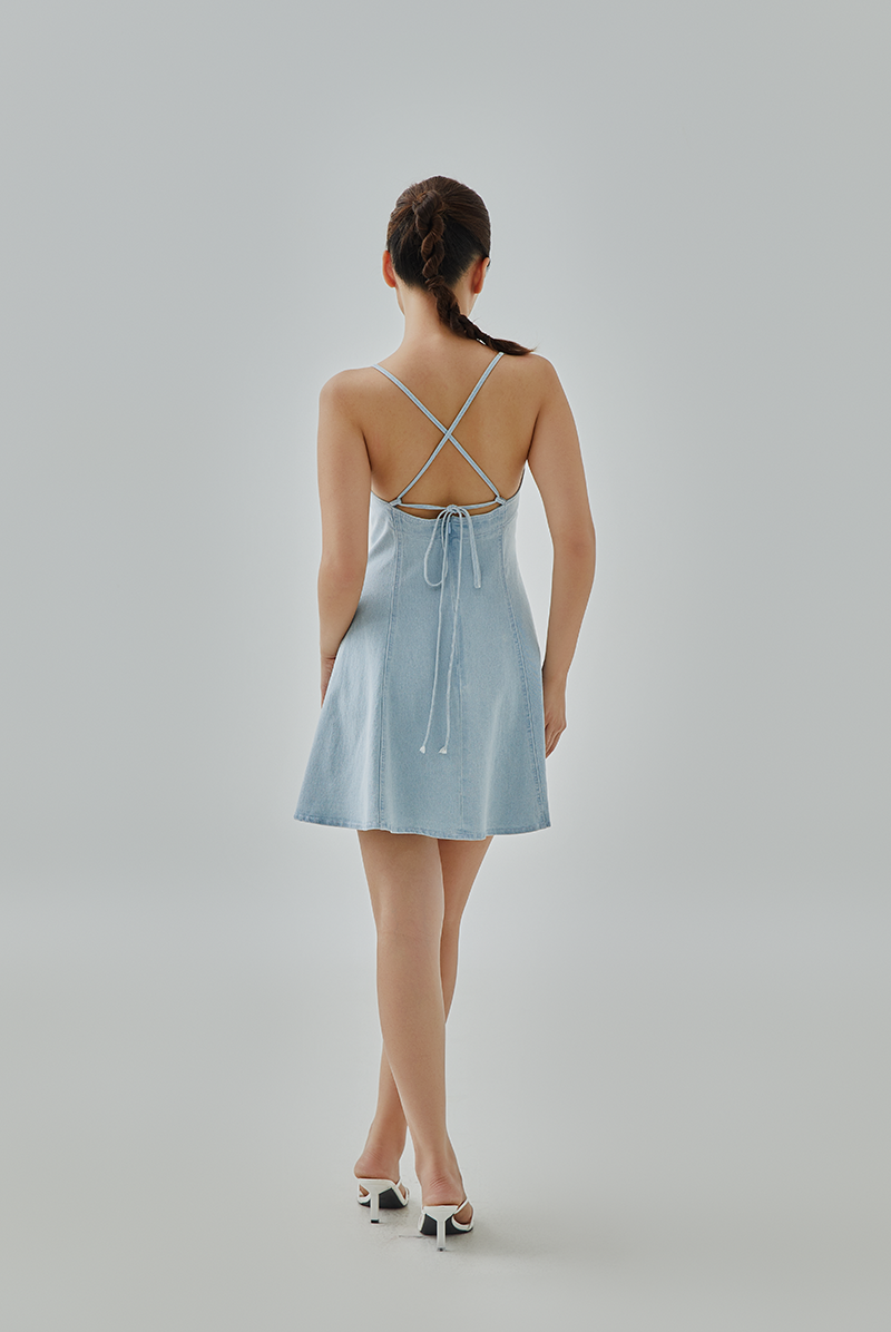 Flirty, fun, and effortlessly chic! This mini denim A-line dress features sleek front panels for a structured look, a playful self-tie open back, and a hidden zipper for a seamless finish. Sleeveless and breezy, it's the perfect blend of casual and cute—just add your fave sneakers or strappy heels!