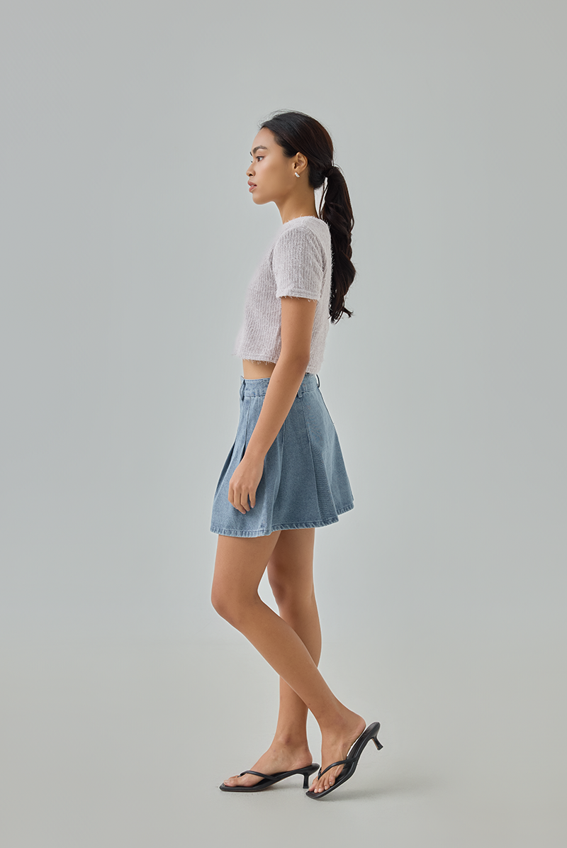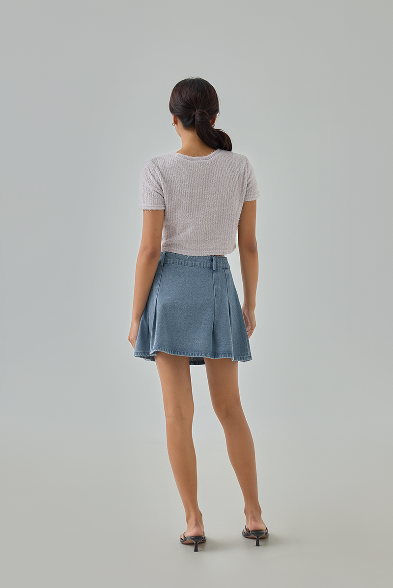 Effortlessly chic, this high-waisted pleated denim skirt is a versatile wardrobe essential with functional details that combine style and practicality.