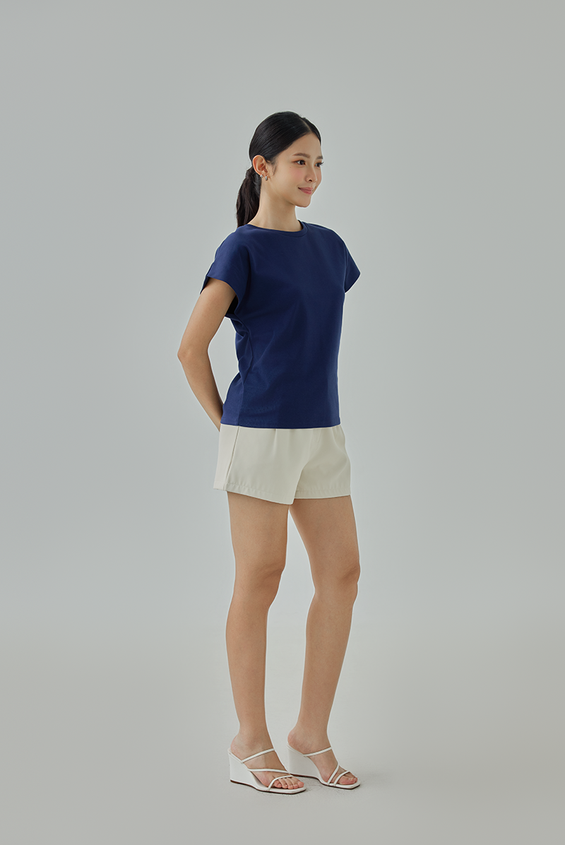 This T-shirt blends casual comfort with a unique style. It features a classic round neckline and short kimono sleeves with a relaxed fit. The thick sleeve hems add a subtle, bold touch, while the center-back line detail hints at sophistication to this minimalist piece.