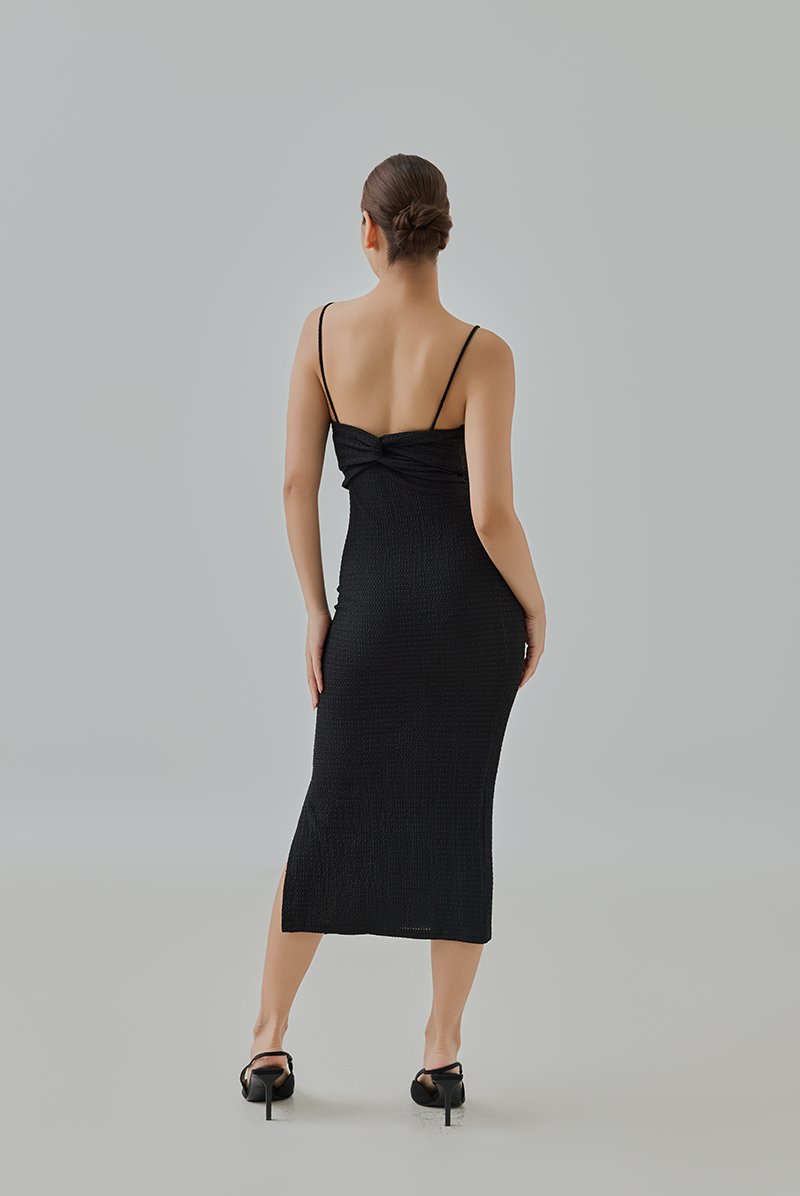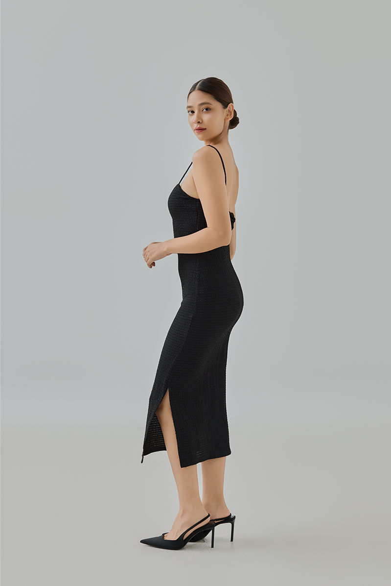 Sleek yet subtly detailed, the Lila Textured Bodycon Dress is your answer to easy sophistication. Featuring a flattering square neckline, padded bust for gentle shaping, and delicate spaghetti straps, it’s designed to enhance without effort. The textured fabric hugs in all the right places, while back ruching and a side slit ensure both comfort and allure.