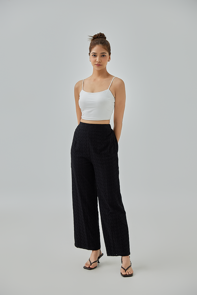 Chic and versatile, these embroidered pants feature a sleek high-front waistband for a polished look, balanced by an elastic back for all-day comfort. Delicate embroidery adds a touch of elegance, making them perfect for dressing up or down!