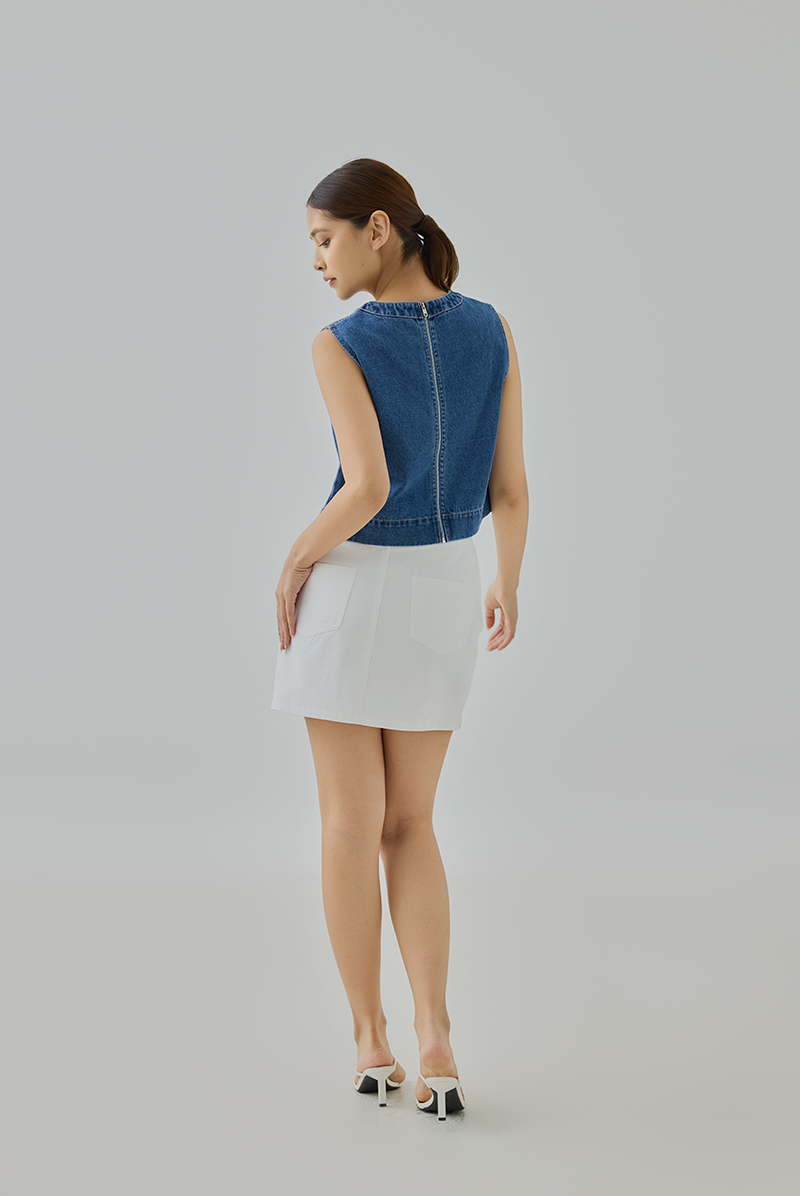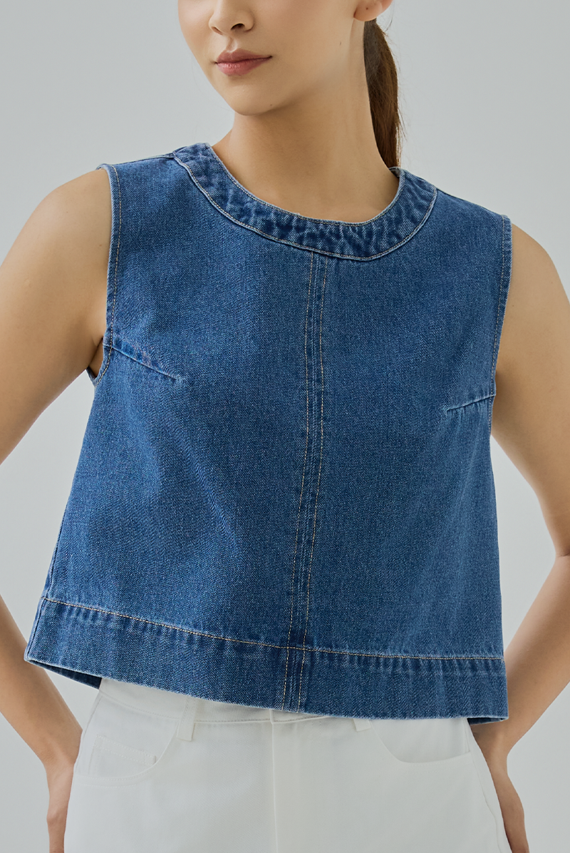 A timeless denim essential with a modern twist. Mara features a clean sleeveless cut and structured silhouette, finished with a sleek exposed metal zipper running from neckline to hem at the back. Effortlessly versatile, it’s the perfect top to dress up or down.