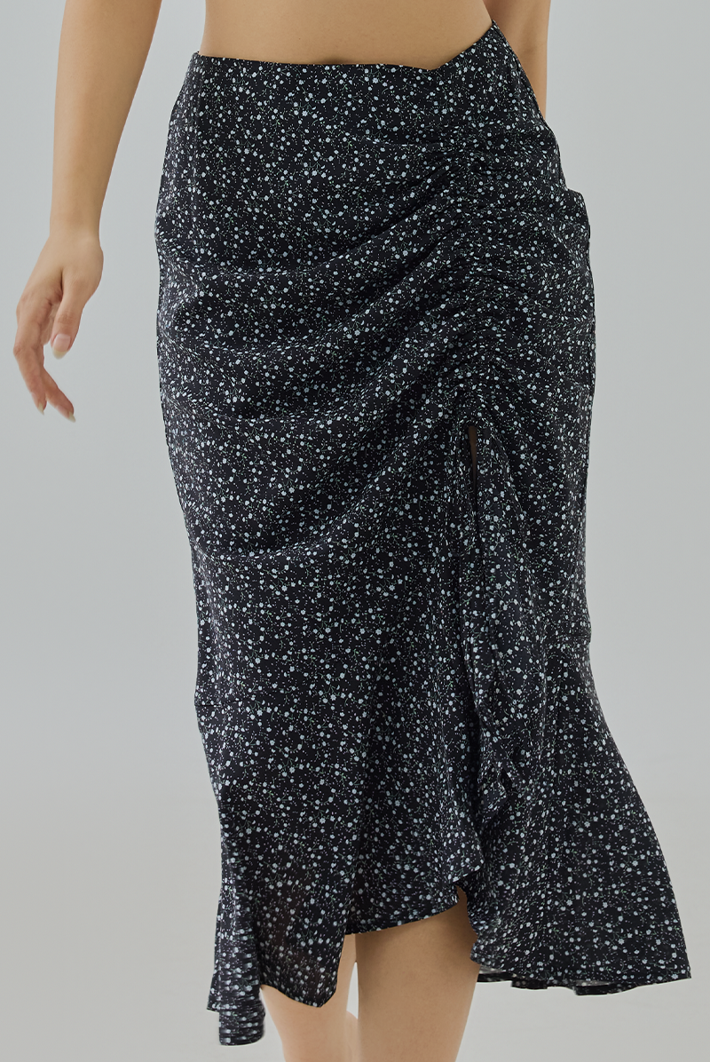 Meet Mira — the effortlessly flirty skirt that dances with every step. Designed in a delicate clustered floral print, she features an adjustable soft side ruching that flatters the silhouette and a subtle front slit for just the right hint of allure. The flowy hemline moves with grace, making her perfect for both brunch dates and breezy nights out.