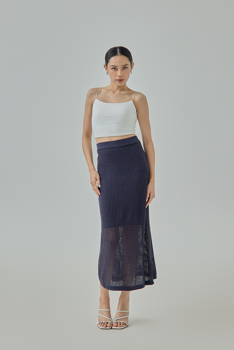 A sleek knit midi skirt designed with a textured open-knit finish. The elastic waistband hugs comfortably at the waist and hips, while the semi-sheer lower panel adds light movement and subtle detail.