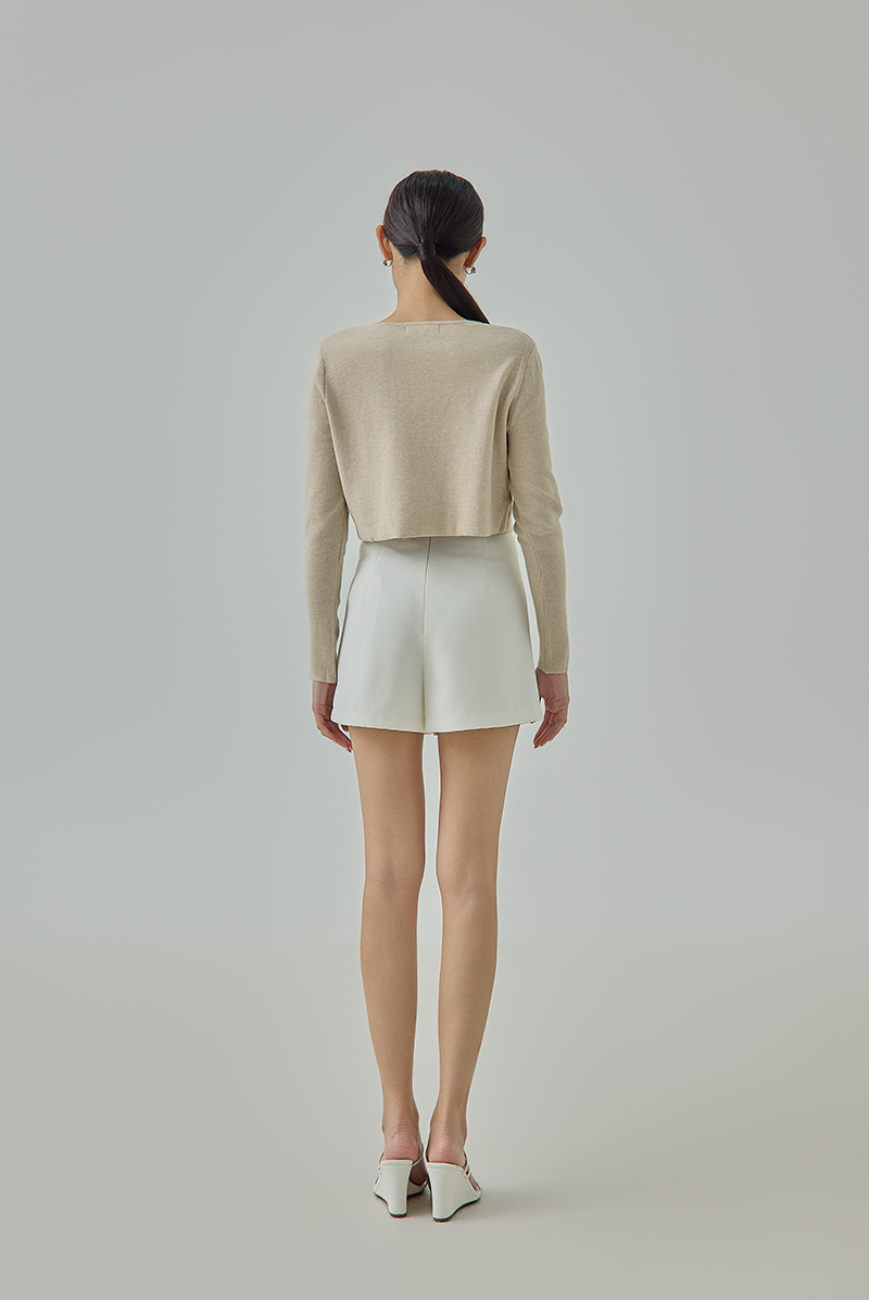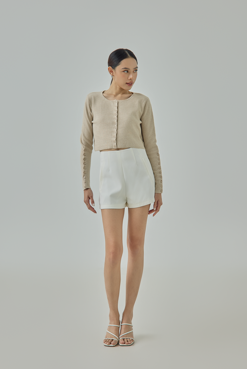 Finally back by popular demand and with a new color (Image for Oat will be uploaded soon)! The fitted cardigan, with its snug silhouette, features a row of dainty buttons running down the center front and along the sleeves, adding a touch of understated elegance. Cropped at just the right length, it highlights the waist. Paired with our matching Pixie Knit Camisole, this duo is perfect for layering or wearing solo, offering a blend of comfort and sophistication for cool-weather days.