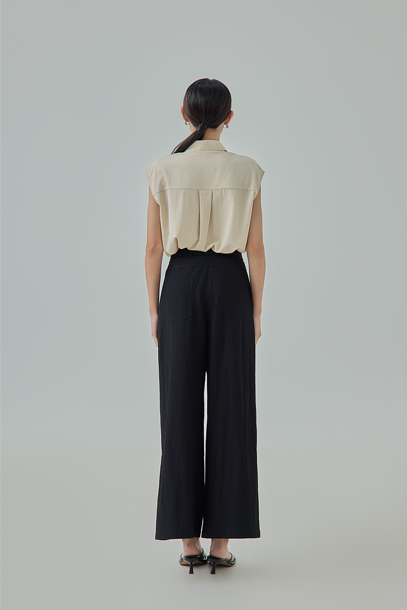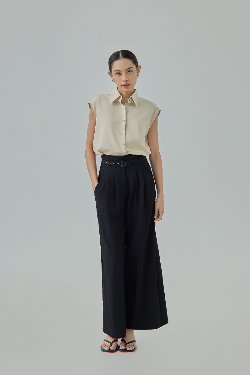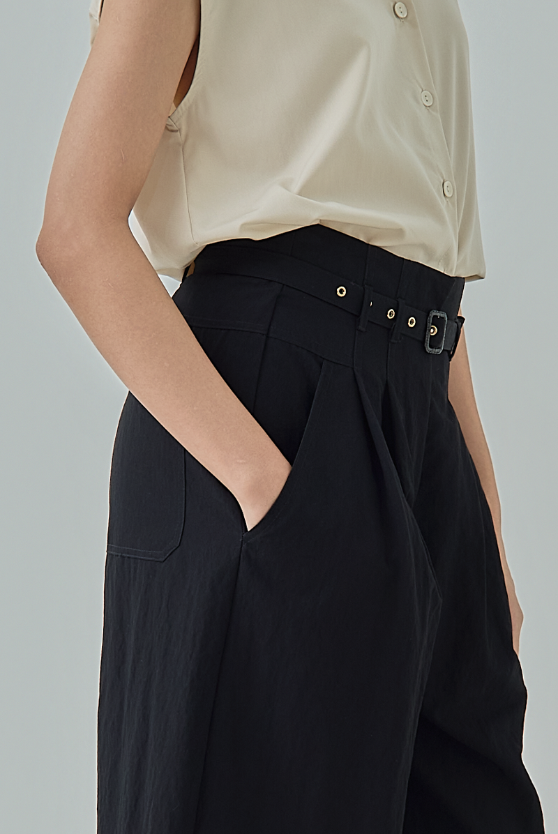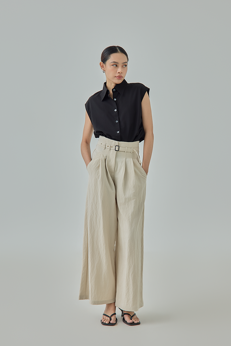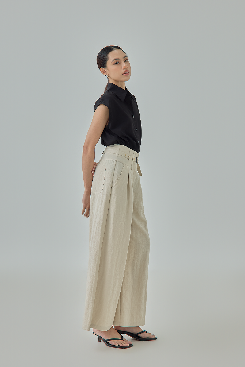 A modern pair of wide-leg pants designed with soft pleats and a relaxed silhouette for effortless elegance. The detachable belt cinches the waist for a flattering fit while allowing versatile styling options depending on the look you want to achieve.