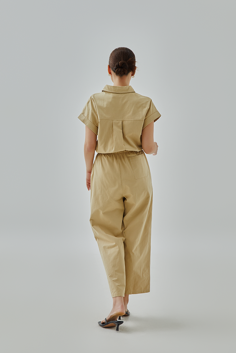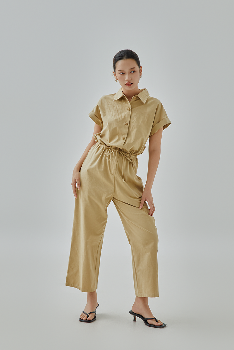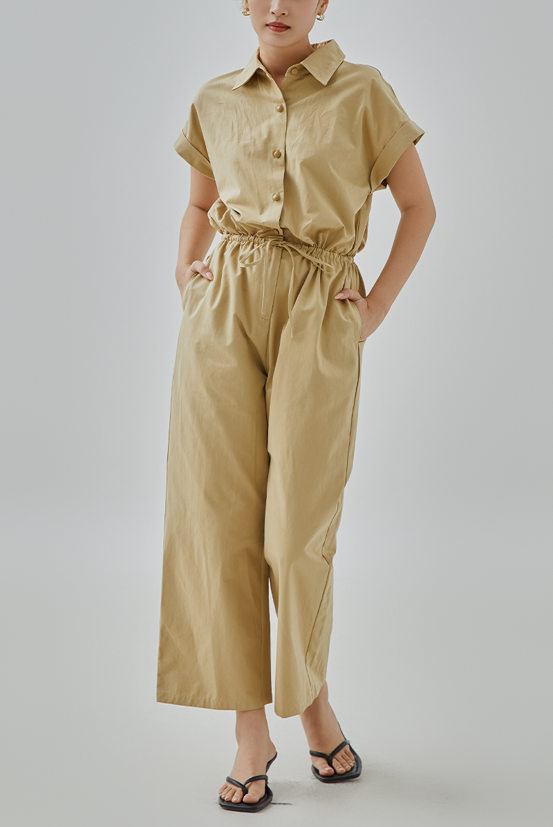 A stylish, collared jumpsuit featuring functional buttons down the bodice, short folded cuff sleeves, and a flattering drawstring waist. It includes a hidden zip closure and functional side and back pockets. A back yoke with a pleat, finished with straight-leg trousers for a sleek, effortless look. Best for comfort and style.