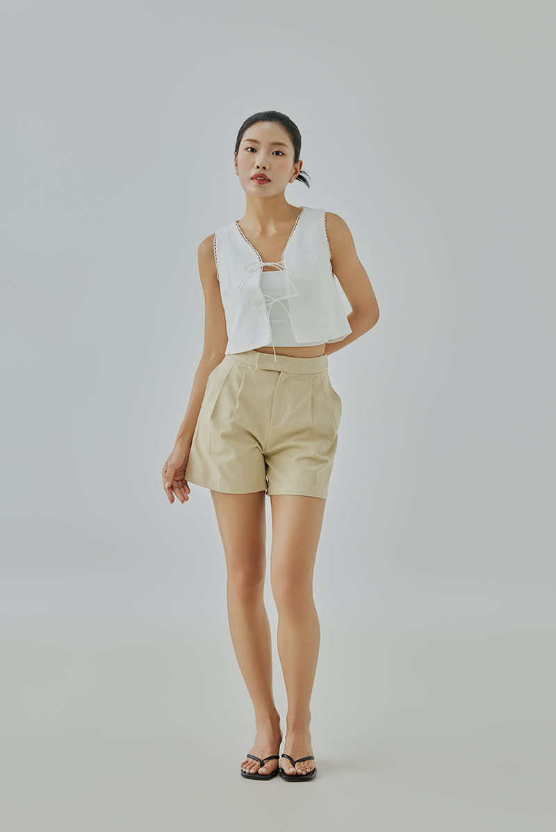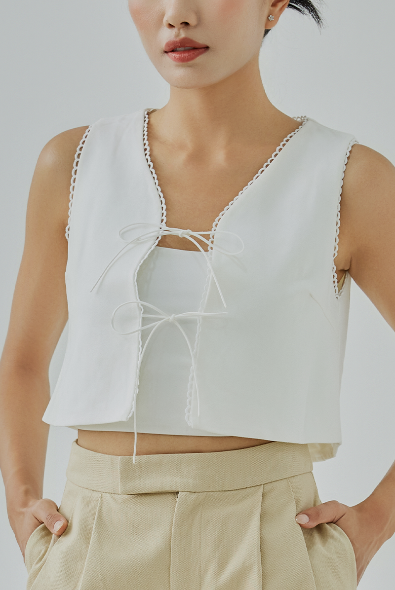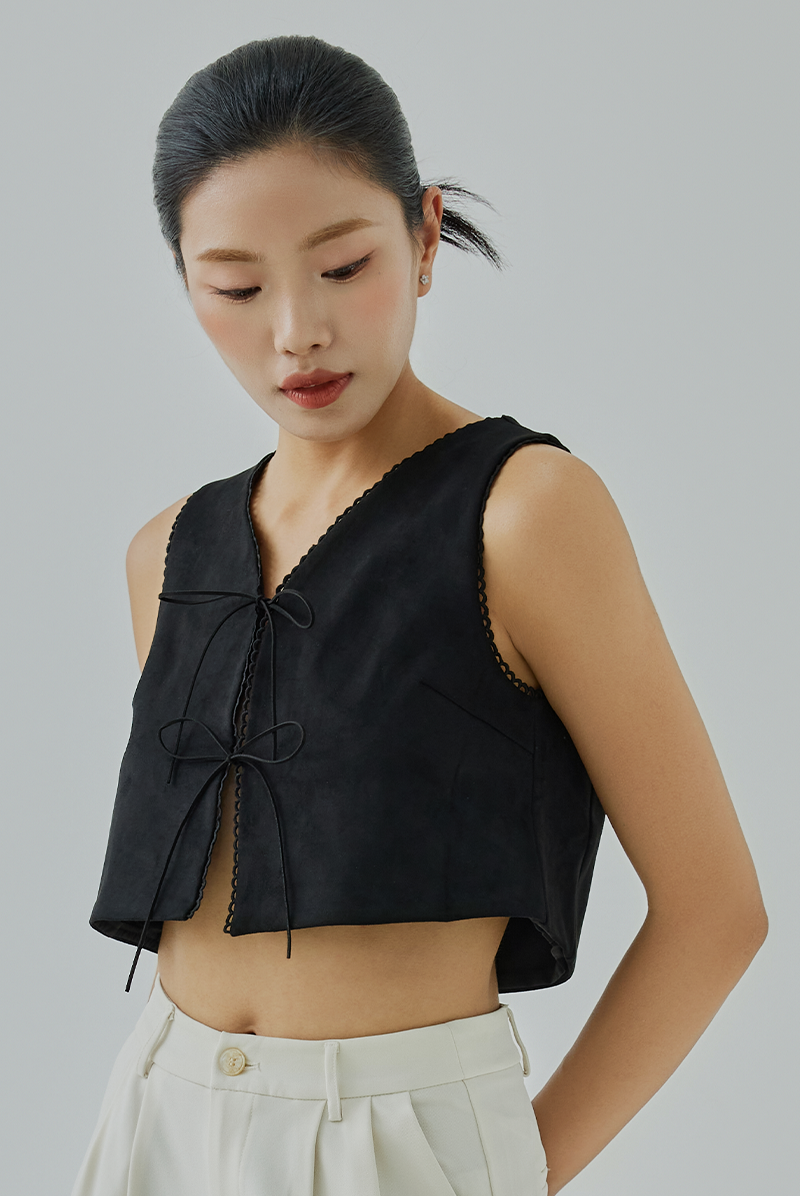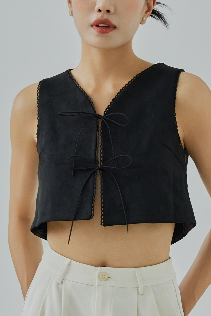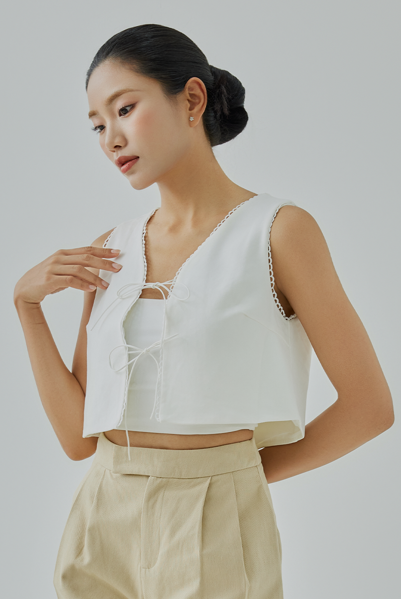 This modern vest features a sleek, cropped silhouette with a front self-tie closure, allowing for an adjustable and customizable fit. The eyelet detailing along the edges adds a subtle yet stylish touch, enhancing its contemporary appeal. Sleeveless and designed for a chic, minimalist look, this piece is perfect for layering or wearing solo for a fresh, fashion-forward statement.