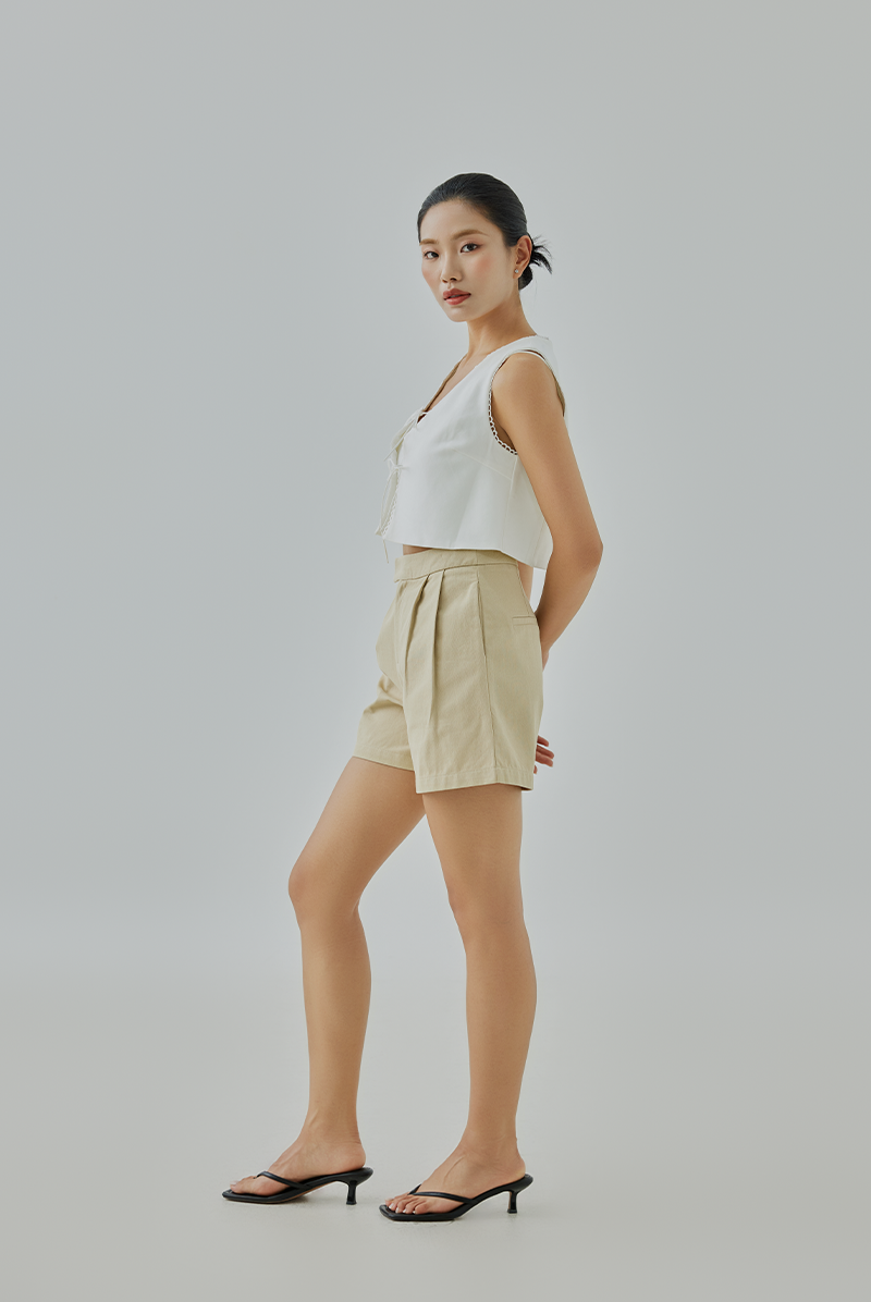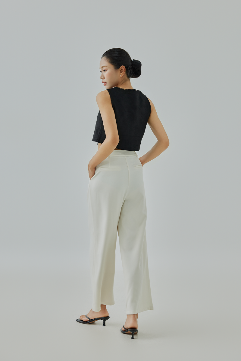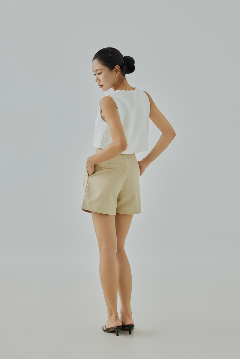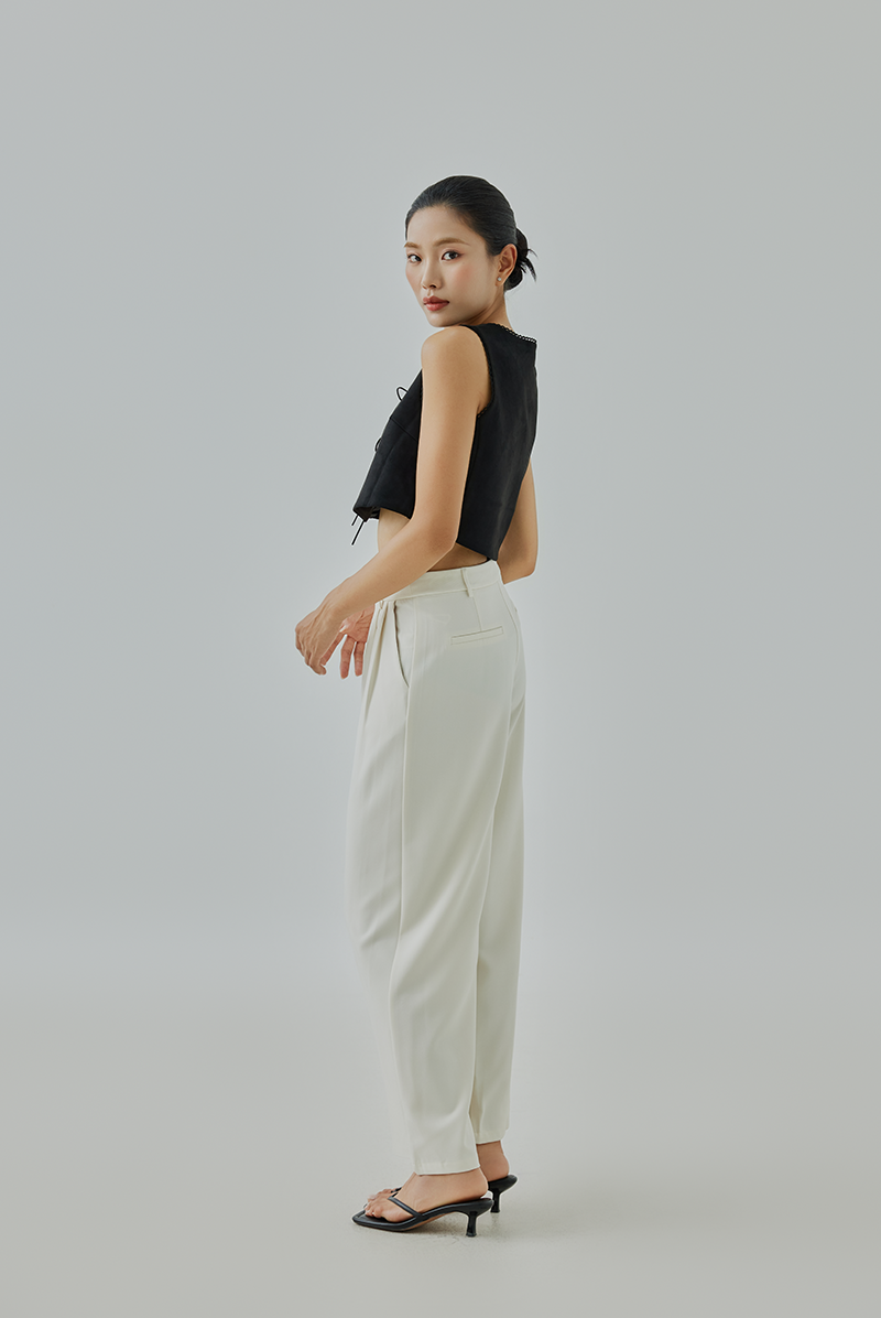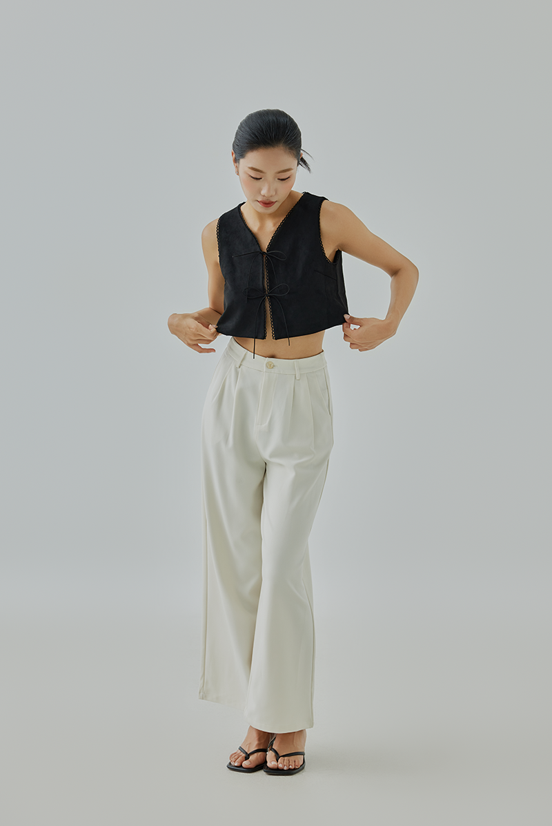 This modern vest features a sleek, cropped silhouette with a front self-tie closure, allowing for an adjustable and customizable fit. The eyelet detailing along the edges adds a subtle yet stylish touch, enhancing its contemporary appeal. Sleeveless and designed for a chic, minimalist look, this piece is perfect for layering or wearing solo for a fresh, fashion-forward statement.