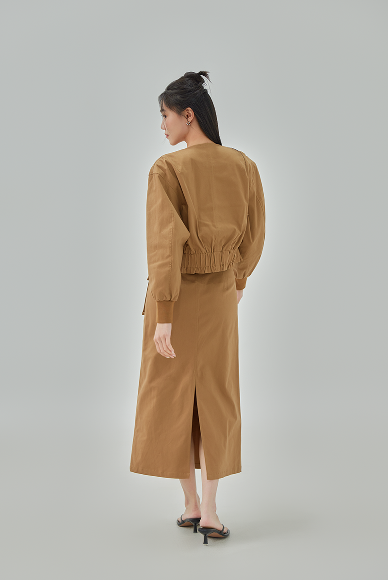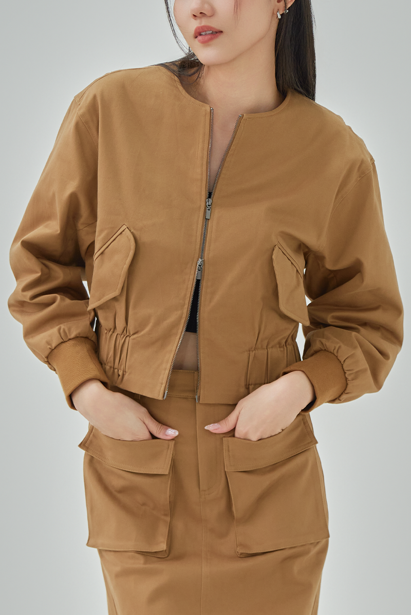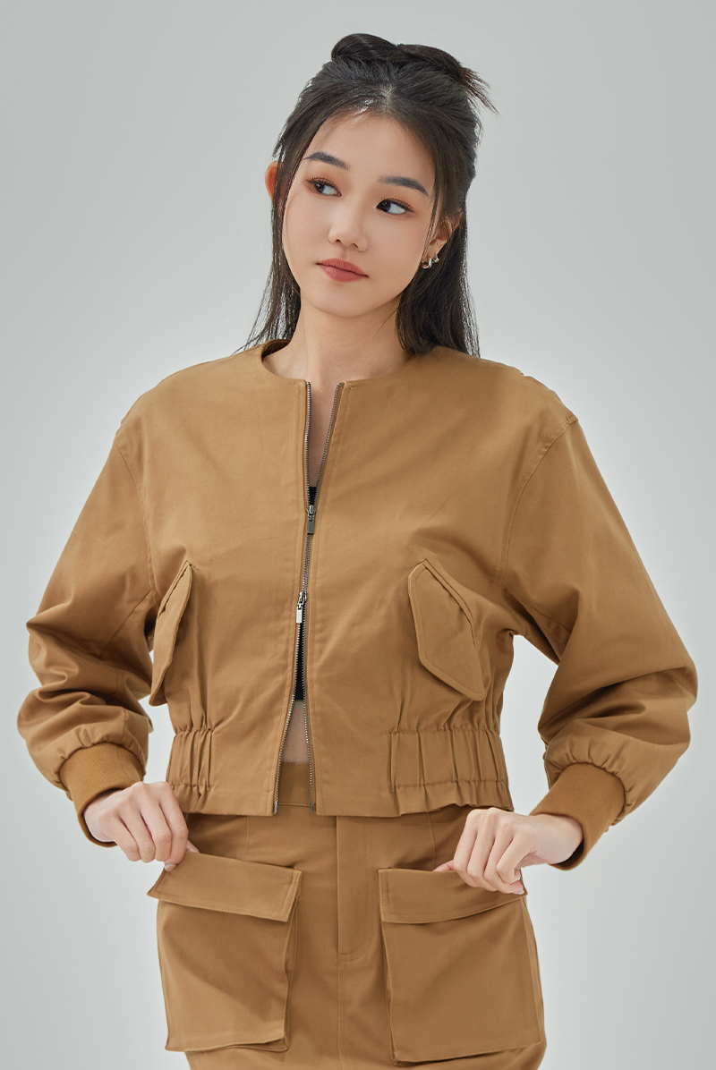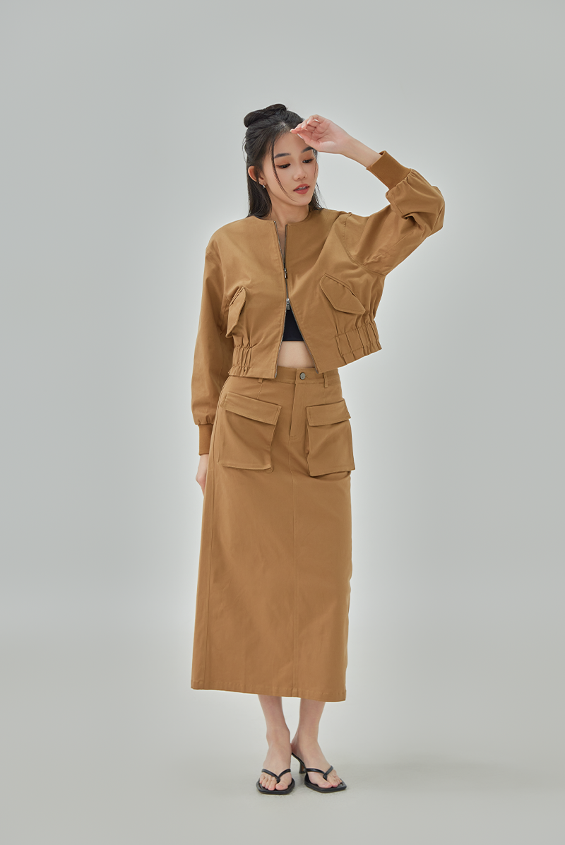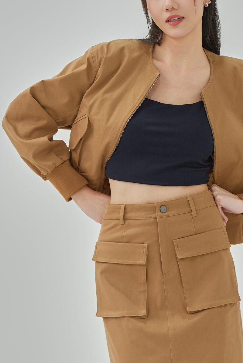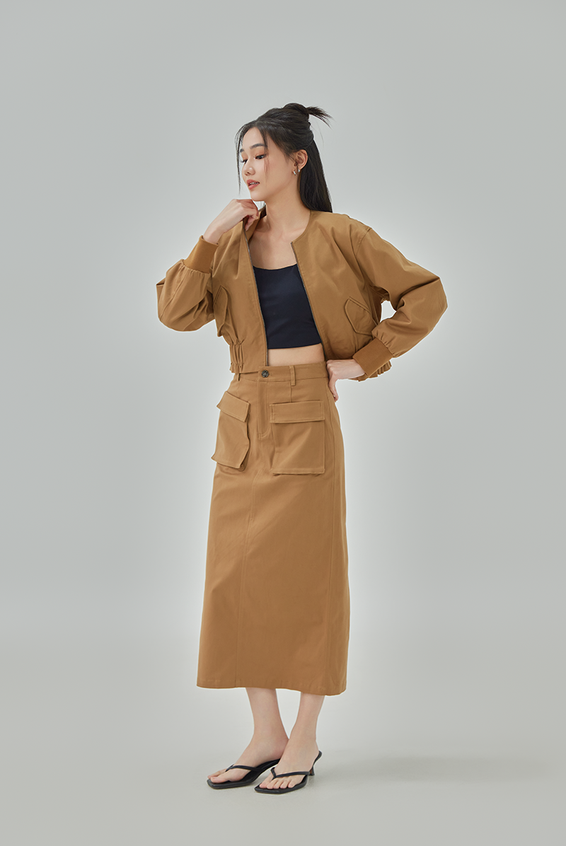 A sleek, structured piece with a 2-way zipper for versatile styling, functional front flap pockets for utility, and a thick elastic waistband that cinches just right. The thick ribbed knit cuffs add a snug, cozy feel, making it perfect for layering. Paired with our matching Tian High Waisted Cargo Skirt, this co-ord set blends street-style edge with everyday practicality